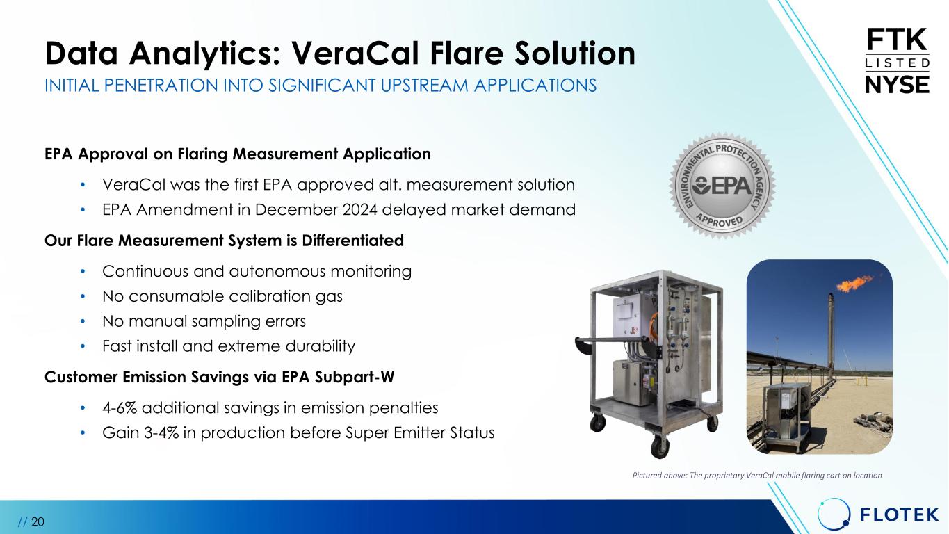 Data Analytics: VeraCal Flare Solution // 20 INITIAL PENETRATION INTO SIGNIFICANT UPSTREAM APPLICATIONS Pictured above: The proprietary VeraCal mobile flaring cart on location EPA Approval on Flaring Measurement Application • VeraCal was the first EPA approved alt. measurement solution • EPA Amendment in December 2024 delayed market demand Our Flare Measurement System is Differentiated • Continuous and autonomous monitoring • No consumable calibration gas • No manual sampling errors • Fast install and extreme durability Customer Emission Savings via EPA Subpart-W • 4-6% additional savings in emission penalties • Gain 3-4% in production before Super Emitter Status