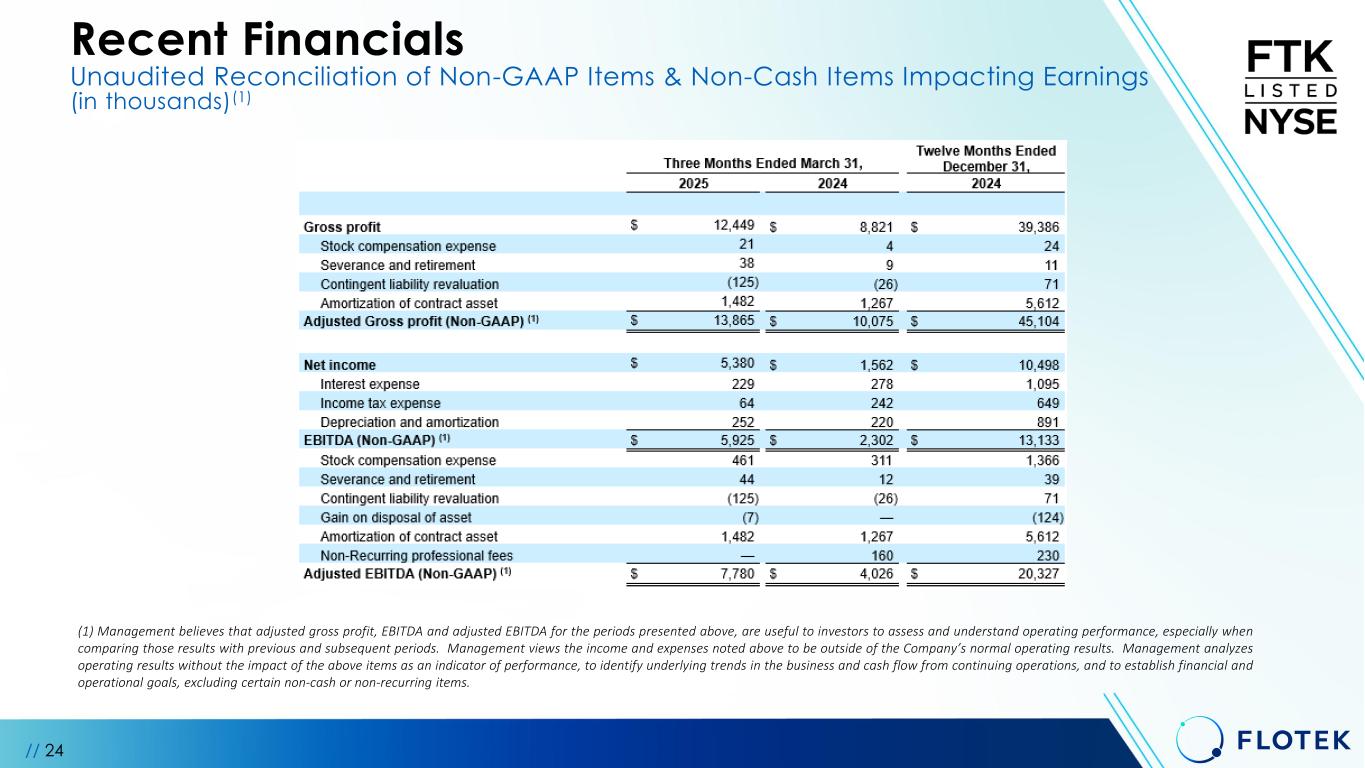 // 24 (1) Management believes that adjusted gross profit, EBITDA and adjusted EBITDA for the periods presented above, are useful to investors to assess and understand operating performance, especially when comparing those results with previous and subsequent periods. Management views the income and expenses noted above to be outside of the Company’s normal operating results. Management analyzes operating results without the impact of the above items as an indicator of performance, to identify underlying trends in the business and cash flow from continuing operations, and to establish financial and operational goals, excluding certain non-cash or non-recurring items. Recent Financials Unaudited Reconciliation of Non-GAAP Items & Non-Cash Items Impacting Earnings (in thousands)(1)