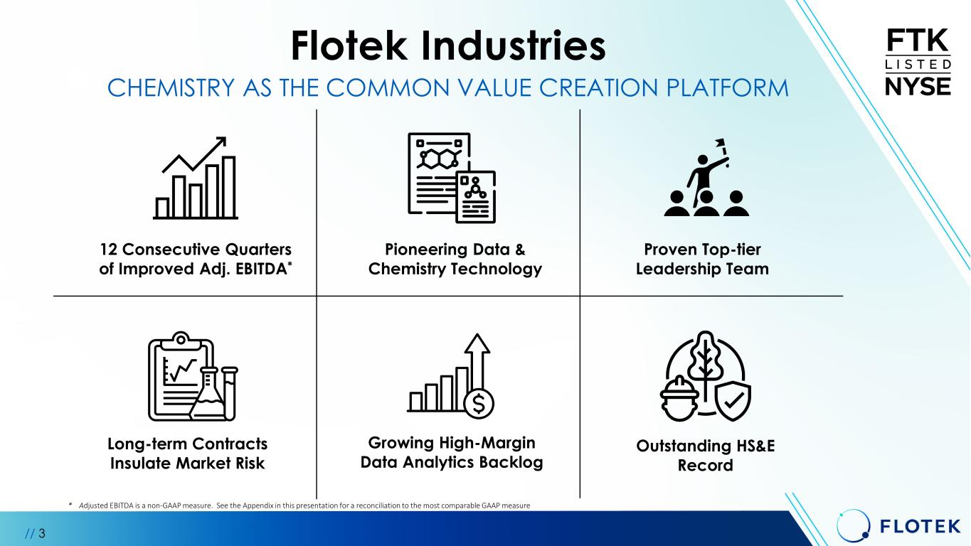 Forward-Looking Statements Certain statements set forth in this presentation constitute forward-looking statements (within the meaning of Section 27A of the Securities Act of 1933 and Section 21E of the Securities Exchange Act of 1934) regarding Flotek Industries, Inc.’s business, financial condition, results of operations and prospects. Words such as will, continue, expects, anticipates, intends, plans, believes, seeks, estimates and similar expressions or variations of such words are intended to identify forward-looking statements, but are not the exclusive means of identifying forward-looking statements in this presentation. Although forward-looking statements in this presentation reflect the good faith judgment of management, such statements can only be based on facts and factors currently known to management. Consequently, forward-looking statements are inherently subject to risks and uncertainties, and actual results and outcomes may differ materially from the results and outcomes discussed in the forward-looking statements. Further information about the risks and uncertainties that may impact the Company are set forth in the Company’s most recent filing with the Securities and Exchange Commission on Form 10-K and Form 10-Q (including, without limitation, in the "Risk Factors" section thereof), and in the Company’s other SEC filings and publicly available documents. Readers are urged not to place undue reliance on these forward-looking statements, which speak only as of the date of this presentation. The Company undertakes no obligation to revise or update any forward-looking statements in order to reflect any event or circumstance that may arise after the date of this presentation. This presentation includes certain non-GAAP measures. Please refer to the reconciliations provided in the earnings press release and the appendix in this presentation for the most comparable GAAP measure. // 2