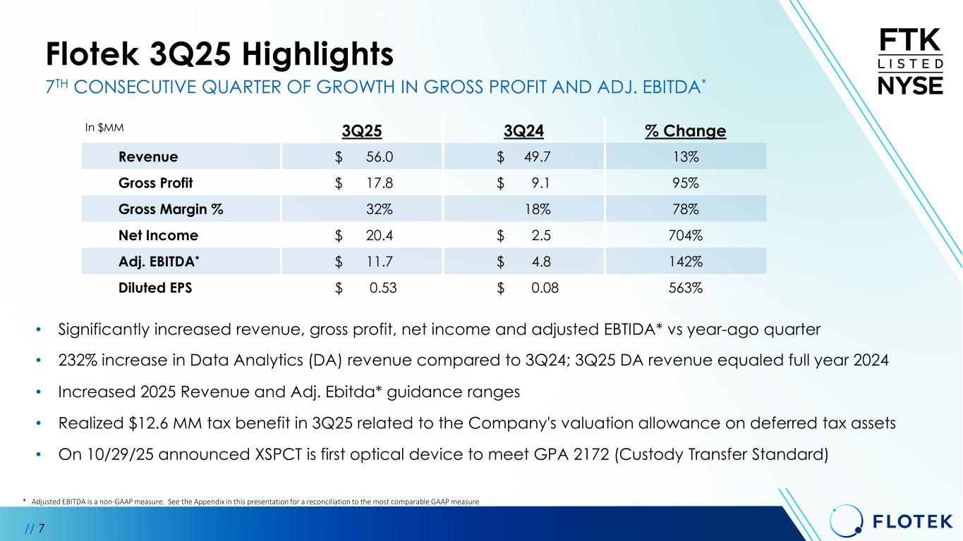 13% 87% 3Q24 Gross Profit Data Analytics Chemistry Technologies Continued Quarter Over Quarter Growth // 6 Sustainable chemistry solutions to maximize customer’s value chain while minimizing their environmental impact Transforming business through real-time data, monitoring and process control across the energy value chain utilizing proprietary technologies Chemistry Technologies Data Analytics 232% GROWTH IN HIGH MARGIN DATA ANALYTICS REVENUES FLOTEK INDUSTRIES PROFILE: Founded: 1985 Employees: 162 Headquarters: Houston Patents: >130 35% 65% 3Q25 Gross Profit $9.1MM $17.8MM