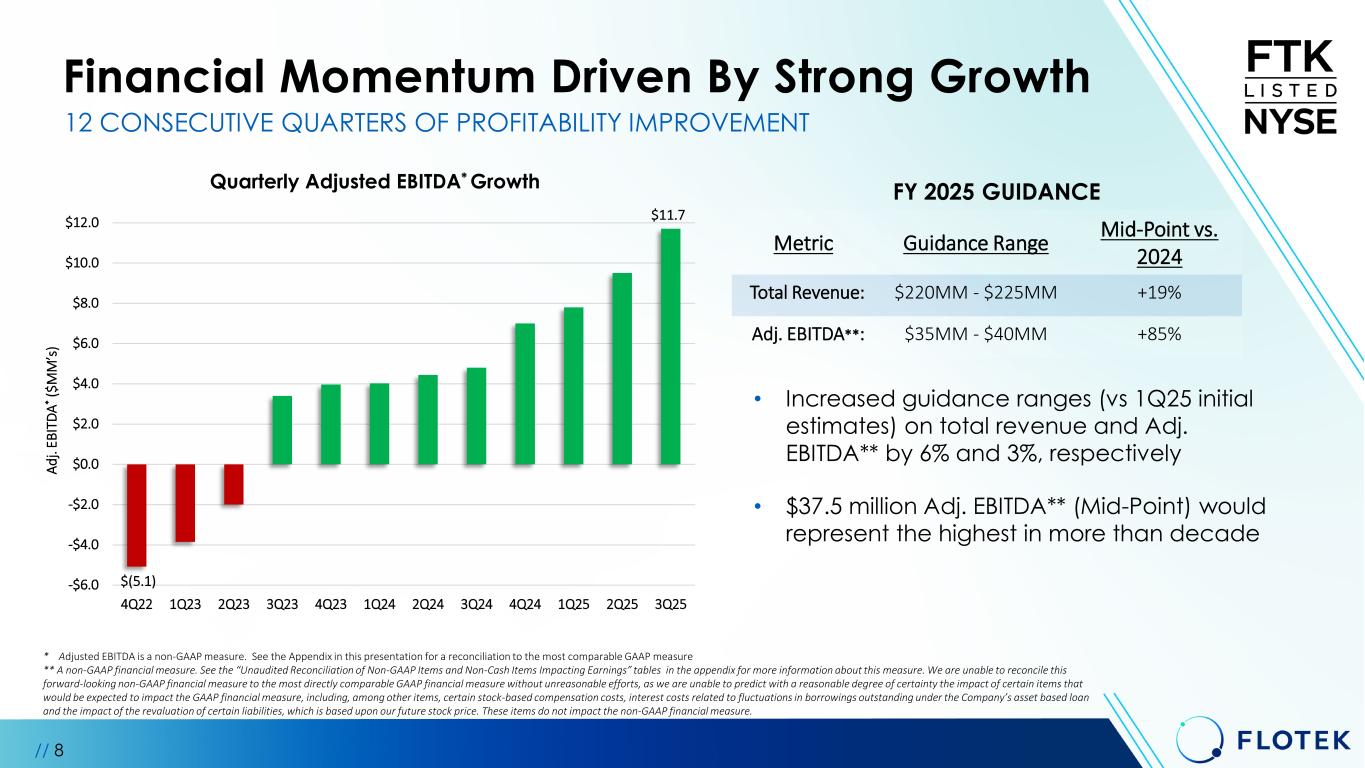 • Significantly increased revenue, gross profit, net income and adjusted EBTIDA* vs year-ago quarter • 232% increase in Data Analytics (DA) revenue compared to 3Q24; 3Q25 DA revenue equaled full year 2024 • Increased 2025 Revenue and Adj. Ebitda* guidance ranges • Realized $12.6 MM tax benefit in 3Q25 related to the Company's valuation allowance on deferred tax assets • On 10/29/25 announced XSPCT is first optical device to meet GPA 2172 (Custody Transfer Standard) Flotek 3Q25 Highlights // 7 7TH CONSECUTIVE QUARTER OF GROWTH IN GROSS PROFIT AND ADJ. EBITDA* * Adjusted EBITDA is a non-GAAP measure. See the Appendix in this presentation for a reconciliation to the most comparable GAAP measure In $MM 3Q25 3Q24 % Change Revenue $ 56.0 $ 49.7 13% Gross Profit $ 17.8 $ 9.1 95% Gross Margin % 32% 18% 78% Net Income $ 20.4 $ 2.5 704% Adj. EBITDA* $ 11.7 $ 4.8 142% Diluted EPS $ 0.53 $ 0.08 563%