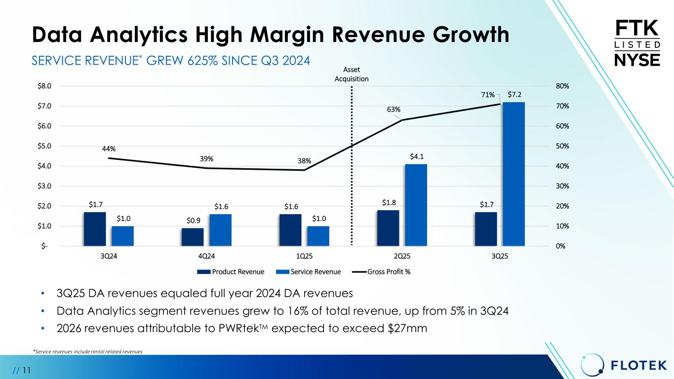 SERVICE REVENUE* GREW 625% SINCE Q3 2024 Data Analytics High Margin Revenue Growth • 3Q25 DA revenues equaled full year 2024 DA revenues • Data Analytics segment revenues grew to 16% of total revenue, up from 5% in 3Q24 • 2026 revenues attributable to PWRtekTM expected to exceed $27mm Asset Acquisition // 11 $1.7 $0.9 $1.6 $1.8 $1.7 $1.0 $1.6 $1.0 $4.1 $7.2 44% 39% 38% 63% 71% 0% 10% 20% 30% 40% 50% 60% 70% 80% $- $1.0 $2.0 $3.0 $4.0 $5.0 $6.0 $7.0 $8.0 3Q24 4Q24 1Q25 2Q25 3Q25 Product Revenue Service Revenue Gross Profit % *Service revenues include rental related revenues