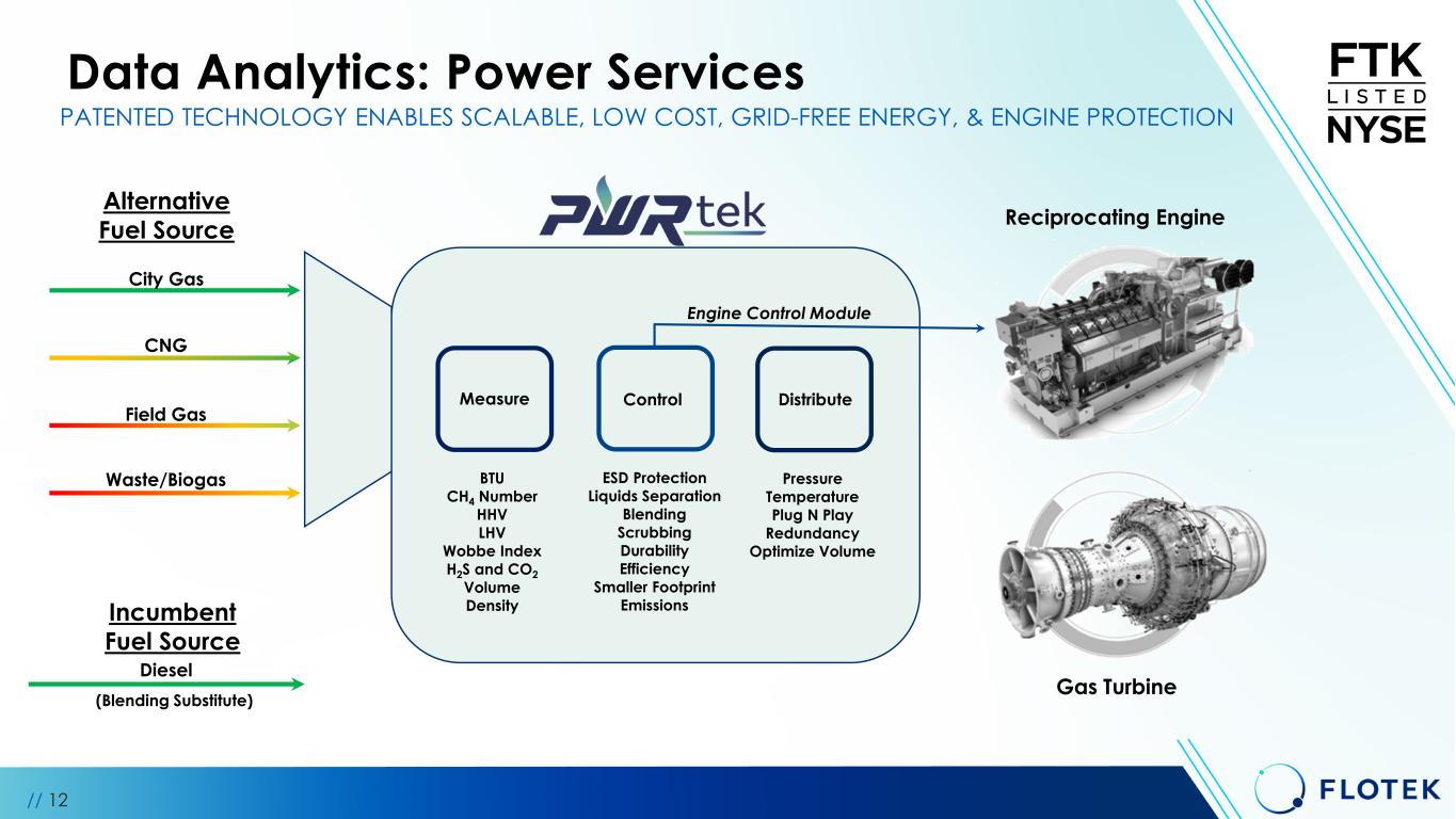 Data Analytics: Power Services // 12 PATENTED TECHNOLOGY ENABLES SCALABLE, LOW COST, GRID-FREE ENERGY, & ENGINE PROTECTION City Gas CNG Field Gas Waste/Biogas Measure Control Distribute Reciprocating Engine Gas Turbine Engine Control Module BTU CH4 Number HHV LHV Wobbe Index H2S and CO2 Volume Density ESD Protection Liquids Separation Blending Scrubbing Durability Efficiency Smaller Footprint Emissions Pressure Temperature Plug N Play Redundancy Optimize Volume Diesel (Blending Substitute) Alternative Fuel Source Incumbent Fuel Source