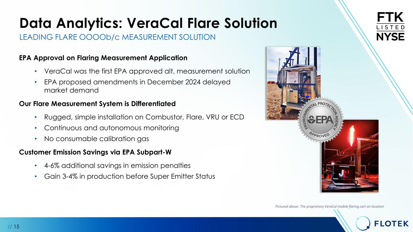 Data Analytics: VeraCal Flare Solution // 15 LEADING FLARE OOOOb/c MEASUREMENT SOLUTION Pictured above: The proprietary VeraCal mobile flaring cart on location EPA Approval on Flaring Measurement Application • VeraCal was the first EPA approved alt. measurement solution • EPA proposed amendments in December 2024 delayed market demand Our Flare Measurement System is Differentiated • Rugged, simple installation on Combustor, Flare, VRU or ECD • Continuous and autonomous monitoring • No consumable calibration gas Customer Emission Savings via EPA Subpart-W • 4-6% additional savings in emission penalties • Gain 3-4% in production before Super Emitter Status