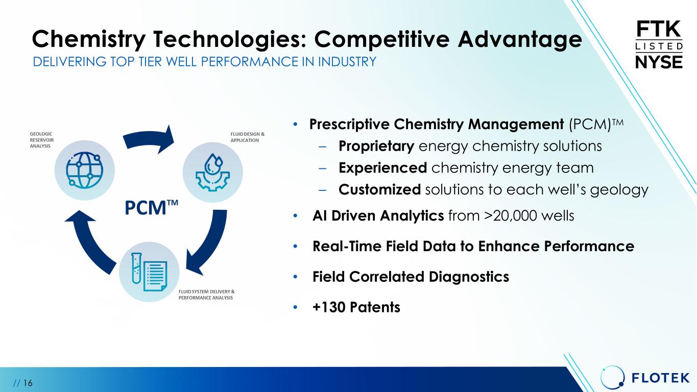 // 16 • Prescriptive Chemistry Management (PCM)TM – Proprietary energy chemistry solutions – Experienced chemistry energy team – Customized solutions to each well’s geology • AI Driven Analytics from >20,000 wells • Real-Time Field Data to Enhance Performance • Field Correlated Diagnostics • +130 Patents DELIVERING TOP TIER WELL PERFORMANCE IN INDUSTRY Chemistry Technologies: Competitive Advantage