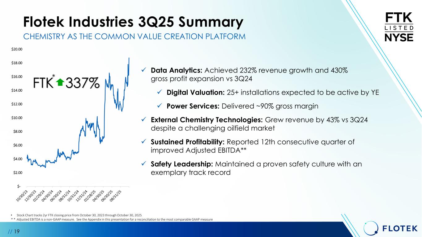 $- $2.00 $4.00 $6.00 $8.00 $10.00 $12.00 $14.00 $16.00 $18.00 $20.00 // 19 Flotek Industries 3Q25 Summary CHEMISTRY AS THE COMMON VALUE CREATION PLATFORM FTK 337%* • Stock Chart tracks 2yr FTK closing price from October 30, 2023 through October 30, 2025 * * Adjusted EBITDA is a non-GAAP measure. See the Appendix in this presentation for a reconciliation to the most comparable GAAP measure  Data Analytics: Achieved 232% revenue growth and 430% gross profit expansion vs 3Q24  Digital Valuation: 25+ installations expected to be active by YE  Power Services: Delivered ~90% gross margin  External Chemistry Technologies: Grew revenue by 43% vs 3Q24 despite a challenging oilfield market  Sustained Profitability: Reported 12th consecutive quarter of improved Adjusted EBITDA**  Safety Leadership: Maintained a proven safety culture with an exemplary track record