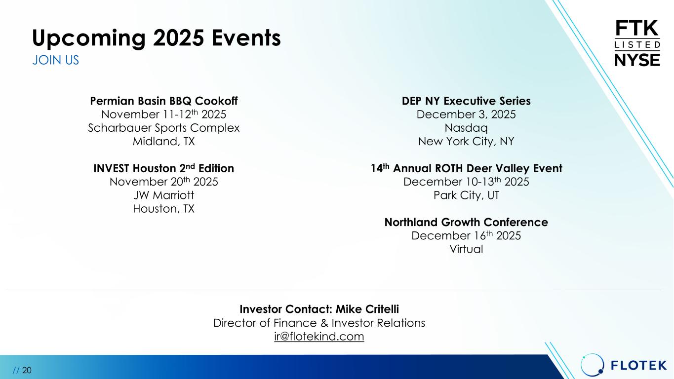 // 20 Permian Basin BBQ Cookoff November 11-12th 2025 Scharbauer Sports Complex Midland, TX INVEST Houston 2nd Edition November 20th 2025 JW Marriott Houston, TX DEP NY Executive Series December 3, 2025 Nasdaq New York City, NY 14th Annual ROTH Deer Valley Event December 10-13th 2025 Park City, UT Northland Growth Conference December 16th 2025 Virtual Investor Contact: Mike Critelli Director of Finance & Investor Relations ir@flotekind.com Upcoming 2025 Events JOIN US