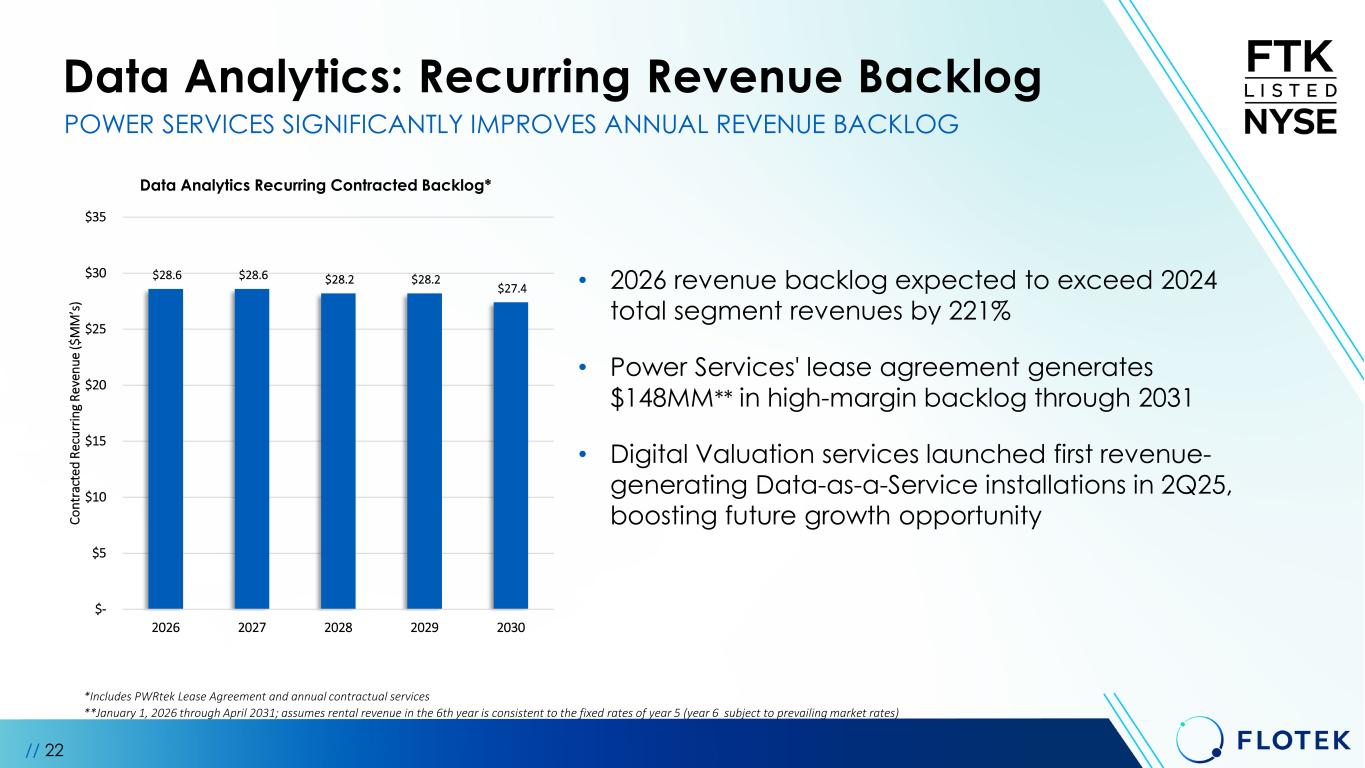 Data Analytics: Recurring Revenue Backlog // 22 • 2026 revenue backlog expected to exceed 2024 total segment revenues by 221% • Power Services' lease agreement generates $148MM** in high-margin backlog through 2031 • Digital Valuation services launched first revenue- generating Data-as-a-Service installations in 2Q25, boosting future growth opportunity POWER SERVICES SIGNIFICANTLY IMPROVES ANNUAL REVENUE BACKLOG $28.6 $28.6 $28.2 $28.2 $27.4 $- $5 $10 $15 $20 $25 $30 $35 2026 2027 2028 2029 2030 Co nt ra ct ed R ec ur rin g Re ve nu e ($ M M ’s ) Data Analytics Recurring Contracted Backlog* *Includes PWRtek Lease Agreement and annual contractual services **January 1, 2026 through April 2031; assumes rental revenue in the 6th year is consistent to the fixed rates of year 5 (year 6 subject to prevailing market rates)