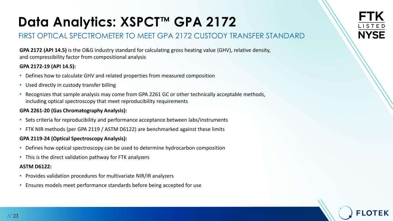 Data Analytics: XSPCT GPA 2172 // 23 FIRST OPTICAL SPECTROMETER TO MEET GPA 2172 CUSTODY TRANSFER STANDARD GPA 2172 (API 14.5) is the O&G industry standard for calculating gross heating value (GHV), relative density, and compressibility factor from compositional analysis GPA 2172-19 (API 14.5): • Defines how to calculate GHV and related properties from measured composition • Used directly in custody transfer billing • Recognizes that sample analysis may come from GPA 2261 GC or other technically acceptable methods, including optical spectroscopy that meet reproducibility requirements GPA 2261-20 (Gas Chromatography Analysis): • Sets criteria for reproducibility and performance acceptance between labs/instruments • FTK NIR methods (per GPA 2119 / ASTM D6122) are benchmarked against these limits GPA 2119-24 (Optical Spectroscopy Analysis): • Defines how optical spectroscopy can be used to determine hydrocarbon composition • This is the direct validation pathway for FTK analyzers ASTM D6122: • Provides validation procedures for multivariate NIR/IR analyzers • Ensures models meet performance standards before being accepted for use