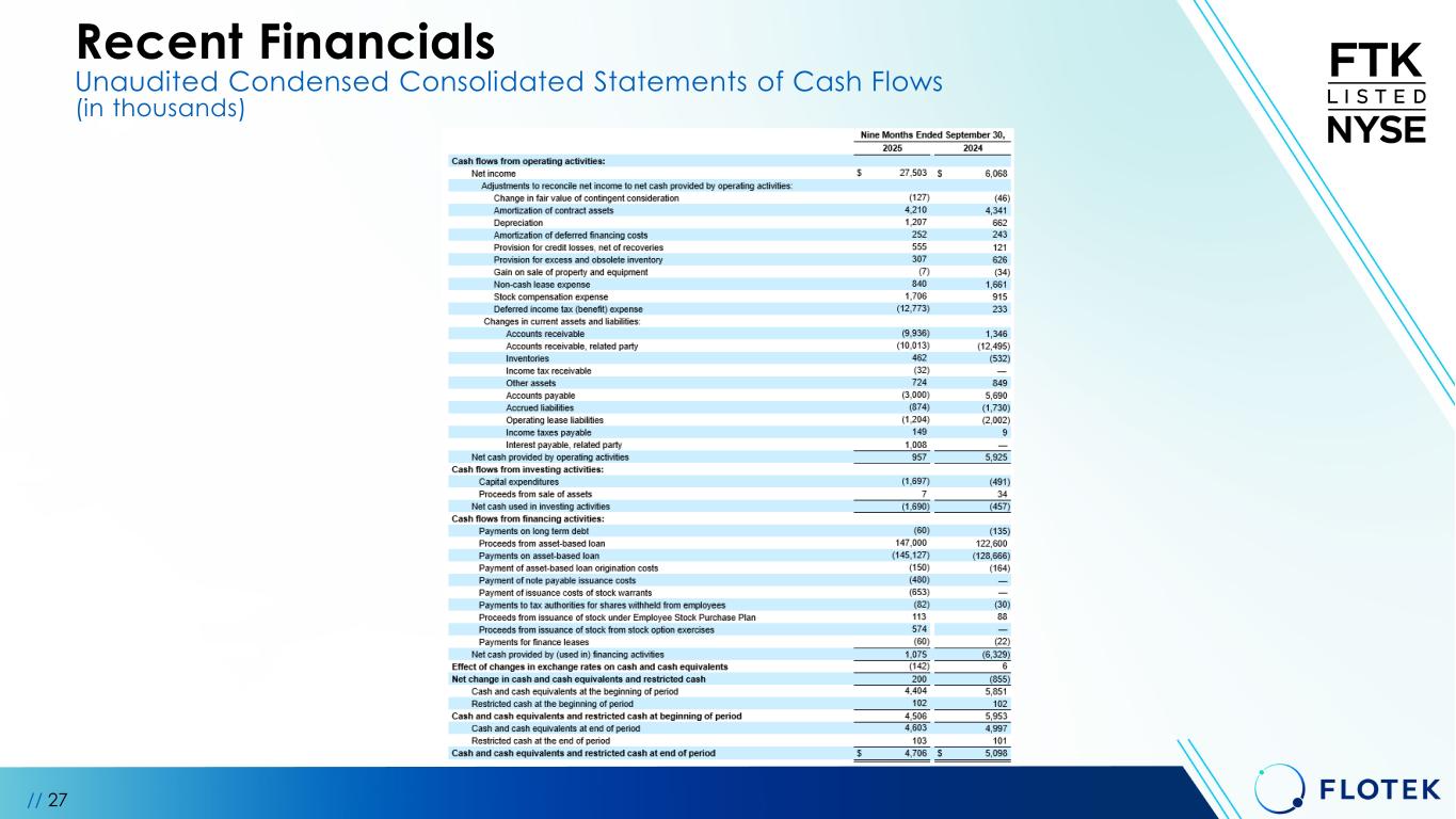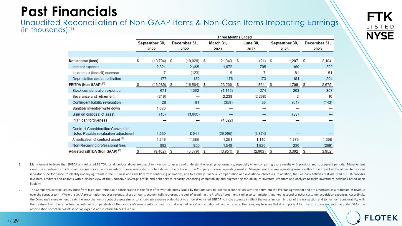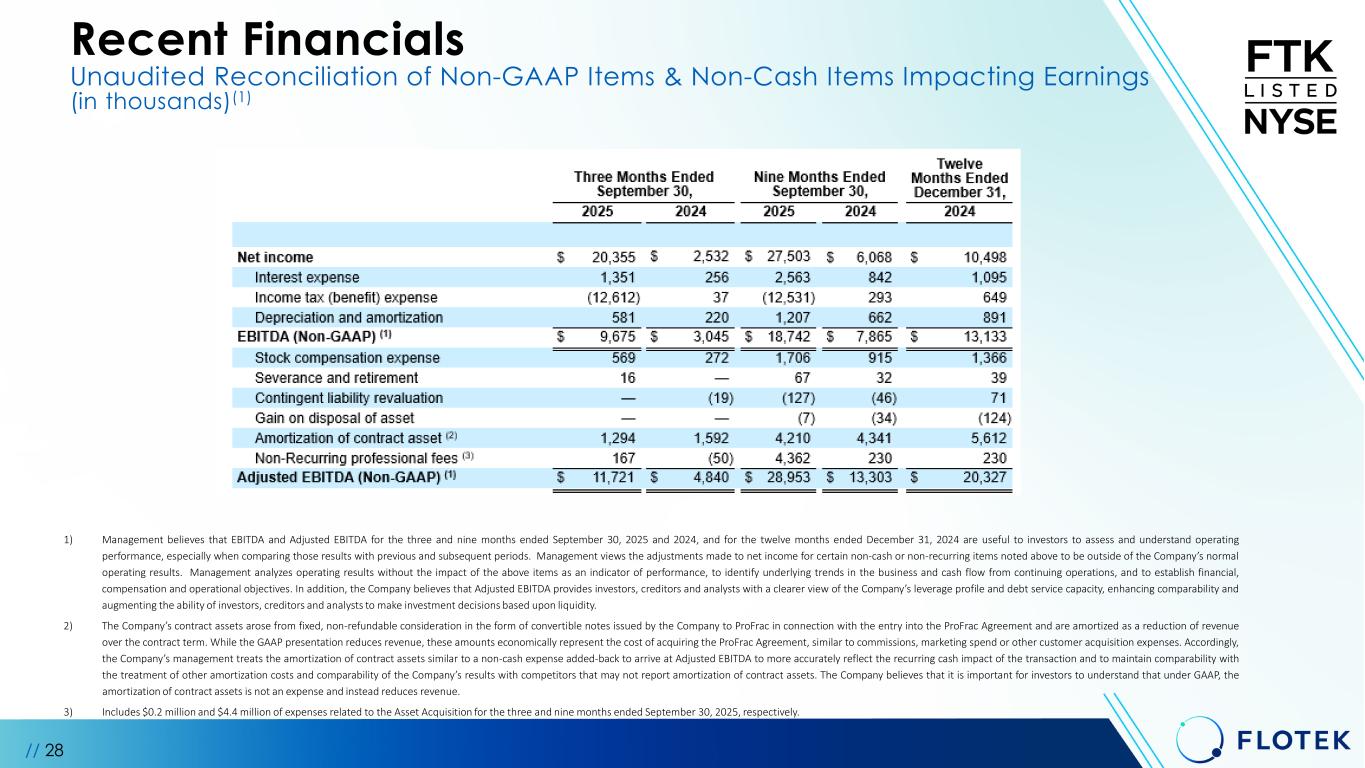 // 28 1) Management believes that EBITDA and Adjusted EBITDA for the three and nine months ended September 30, 2025 and 2024, and for the twelve months ended December 31, 2024 are useful to investors to assess and understand operating performance, especially when comparing those results with previous and subsequent periods. Management views the adjustments made to net income for certain non-cash or non-recurring items noted above to be outside of the Company’s normal operating results. Management analyzes operating results without the impact of the above items as an indicator of performance, to identify underlying trends in the business and cash flow from continuing operations, and to establish financial, compensation and operational objectives. In addition, the Company believes that Adjusted EBITDA provides investors, creditors and analysts with a clearer view of the Company’s leverage profile and debt service capacity, enhancing comparability and augmenting the ability of investors, creditors and analysts to make investment decisions based upon liquidity. 2) The Company’s contract assets arose from fixed, non-refundable consideration in the form of convertible notes issued by the Company to ProFrac in connection with the entry into the ProFrac Agreement and are amortized as a reduction of revenue over the contract term. While the GAAP presentation reduces revenue, these amounts economically represent the cost of acquiring the ProFrac Agreement, similar to commissions, marketing spend or other customer acquisition expenses. Accordingly, the Company’s management treats the amortization of contract assets similar to a non-cash expense added-back to arrive at Adjusted EBITDA to more accurately reflect the recurring cash impact of the transaction and to maintain comparability with the treatment of other amortization costs and comparability of the Company’s results with competitors that may not report amortization of contract assets. The Company believes that it is important for investors to understand that under GAAP, the amortization of contract assets is not an expense and instead reduces revenue. 3) Includes $0.2 million and $4.4 million of expenses related to the Asset Acquisition for the three and nine months ended September 30, 2025, respectively. Recent Financials Unaudited Reconciliation of Non-GAAP Items & Non-Cash Items Impacting Earnings (in thousands)(1)
