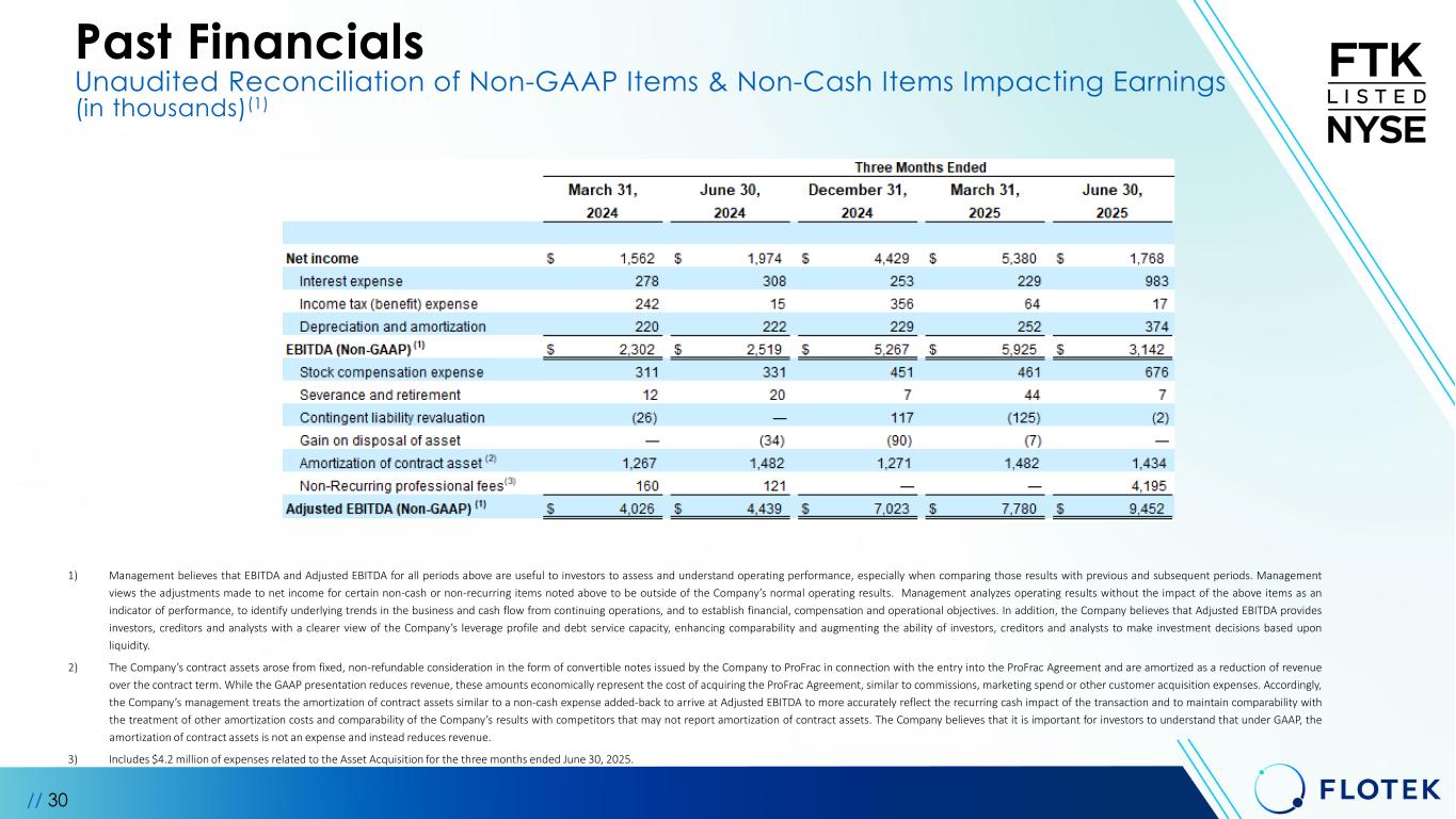 // 29 1) Management believes that EBITDA and Adjusted EBITDA for all periods above are useful to investors to assess and understand operating performance, especially when comparing those results with previous and subsequent periods. Management views the adjustments made to net income for certain non-cash or non-recurring items noted above to be outside of the Company’s normal operating results. Management analyzes operating results without the impact of the above items as an indicator of performance, to identify underlying trends in the business and cash flow from continuing operations, and to establish financial, compensation and operational objectives. In addition, the Company believes that Adjusted EBITDA provides investors, creditors and analysts with a clearer view of the Company’s leverage profile and debt service capacity, enhancing comparability and augmenting the ability of investors, creditors and analysts to make investment decisions based upon liquidity. 2) The Company’s contract assets arose from fixed, non-refundable consideration in the form of convertible notes issued by the Company to ProFrac in connection with the entry into the ProFrac Agreement and are amortized as a reduction of revenue over the contract term. While the GAAP presentation reduces revenue, these amounts economically represent the cost of acquiring the ProFrac Agreement, similar to commissions, marketing spend or other customer acquisition expenses. Accordingly, the Company’s management treats the amortization of contract assets similar to a non-cash expense added-back to arrive at Adjusted EBITDA to more accurately reflect the recurring cash impact of the transaction and to maintain comparability with the treatment of other amortization costs and comparability of the Company’s results with competitors that may not report amortization of contract assets. The Company believes that it is important for investors to understand that under GAAP, the amortization of contract assets is not an expense and instead reduces revenue. Past Financials Unaudited Reconciliation of Non-GAAP Items & Non-Cash Items Impacting Earnings (in thousands)(1)