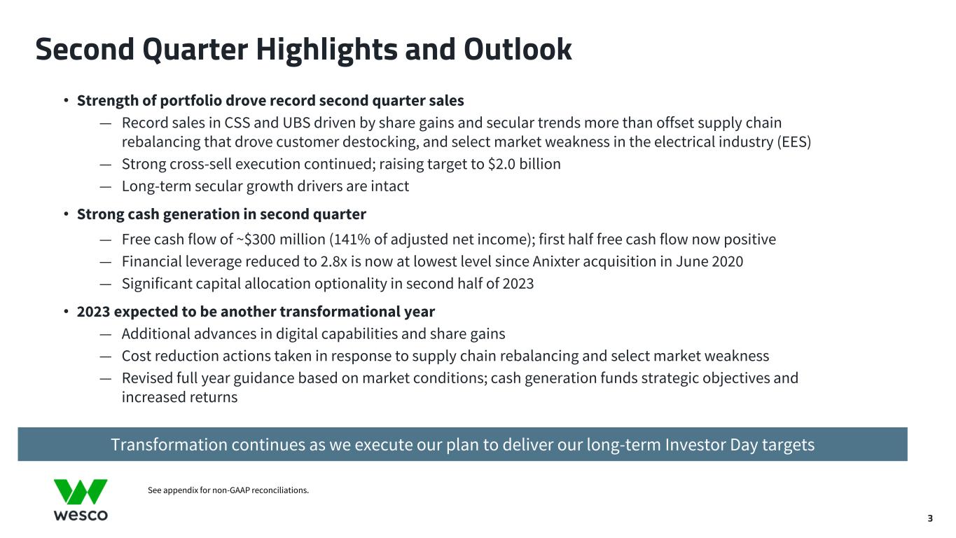 2 All statements made herein that are not historical facts should be considered as “forward-looking statements” within the meaning of the Private Securities Litigation Reform Act of 1995. Such statements involve known and unknown risks, uncertainties and other factors that may cause actual results to differ materially. These statements include, but are not limited to, statements regarding business strategy, growth strategy, competitive strengths, productivity and profitability enhancement, competition, new product and service introductions and liquidity and capital resources, as well as statements regarding the expected benefits and costs of the transaction between Wesco and Anixter International Inc., including anticipated future financial and operating results, synergies, accretion and growth rates, and the combined company's plans, objectives and expectations.. Such statements can generally be identified by the use of words such as "anticipate," "plan," "believe," "estimate," "intend," "expect," "project," and similar words, phrases or expressions or future or conditional verbs such as "could," "may," "should," "will," and "would,” although not all forward-looking statements contain such words. These forward-looking statements are based on current expectations and beliefs of Wesco's management, as well as assumptions made by, and information currently available to, Wesco's management, current market trends and market conditions and involve risks and uncertainties, many of which are outside of Wesco's and Wesco's management's control, and which may cause actual results to differ materially from those contained in forward-looking statements. Accordingly, you should not place undue reliance on such statements. Important factors that could cause actual results or events to differ materially from those presented or implied in the forward-looking statements include, among others, the failure to achieve the expected benefits of the transaction between Wesco and Anixter or the anticipated benefits of Wesco’s acquisition of Rahi Systems Holdings, Inc., in the expected timeframe or at all, unexpected costs or problems that may arise in successfully integrating the businesses of the companies, the impact of increased interest rates or borrowing costs, failure to adequately protect Wesco’s intellectual property or successfully defend against infringement claims, failure to execute Wesco’s environmental, social and governance (ESG) programs as planned; disruption of information technology systems or operations, natural disasters (including as a result of climate change), health epidemics, pandemics and other outbreaks (such as the ongoing COVID-19 pandemic, including any resurgences or new variants), supply chain disruptions, geopolitical issues, such as the impact of Russia's invasion of Ukraine, including the impact of sanctions or other actions taken by the U.S. or other countries against Russia (as well as those imposed on China), the increased risk of cyber incidents and exacerbation of key materials shortages, inflationary cost pressures, material cost increases, demand volatility, and logistics and capacity constraints, which may have a material adverse effect on the combined company's business, results of operations and financial condition. All such factors are difficult to predict and are beyond the company's control. Additional factors that could cause results to differ materially from those described above can be found in Wesco's Annual Report on Form 10-K for the fiscal year ended December 31, 2022 and Wesco's other reports filed with the U.S. Securities and Exchange Commission. Non-GAAP Measures In addition to the results provided in accordance with U.S. Generally Accepted Accounting Principles ("U.S. GAAP"), this presentation includes certain non-GAAP financial measures. These financial measures include organic sales growth, gross profit, gross margin, earnings before interest, taxes, depreciation and amortization (EBITDA), adjusted EBITDA, adjusted EBITDA margin, financial leverage, free cash flow, adjusted selling, general and administrative (“SG&A”) expenses, adjusted income from operations, adjusted operating margin, adjusted provision for income taxes, adjusted income before income taxes, adjusted net income, adjusted net income attributable to Wesco International, Inc., adjusted net income attributable to common stockholders, and adjusted earnings per diluted share. The Company believes that these non-GAAP measures are useful to investors as they provide a better understanding of our financial condition and results of operations on a comparable basis. Additionally, certain non-GAAP measures either focus on or exclude items impacting comparability of results such as merger-related and integration costs, and the related income tax effect of such items, allowing investors to more easily compare the Company's financial performance from period to period. Management does not use these non-GAAP financial measures for any purpose other than the reasons stated above. Forward-Looking Statements