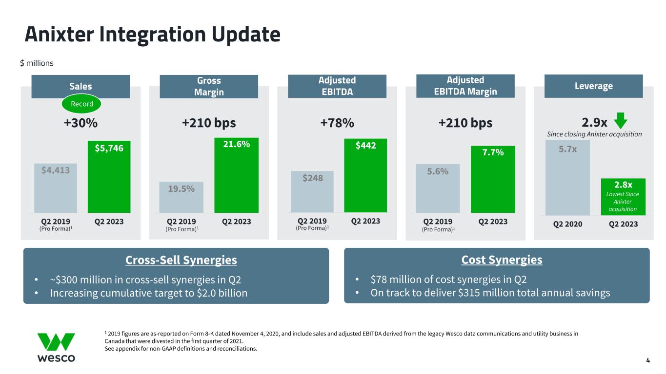 3 Second Quarter Highlights and Outlook Transformation continues as we execute our plan to deliver our long-term Investor Day targets See appendix for non-GAAP reconciliations. • Strength of portfolio drove record second quarter sales ― Record sales in CSS and UBS driven by share gains and secular trends more than offset supply chain rebalancing that drove customer destocking, and select market weakness in the electrical industry (EES) ― Strong cross-sell execution continued; raising target to $2.0 billion ― Long-term secular growth drivers are intact • Strong cash generation in second quarter ― Free cash flow of ~$300 million (141% of adjusted net income); first half free cash flow now positive ― Financial leverage reduced to 2.8x is now at lowest level since Anixter acquisition in June 2020 ― Significant capital allocation optionality in second half of 2023 • 2023 expected to be another transformational year ― Additional advances in digital capabilities and share gains ― Cost reduction actions taken in response to supply chain rebalancing and select market weakness ― Revised full year guidance based on market conditions; cash generation funds strategic objectives and increased returns