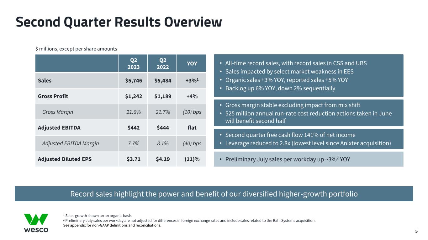 4 Anixter Integration Update $ millions $4,413 $5,746 Q2 2019 Q2 2023 +30% Sales $248 $442 Q2 2019 Q2 2023 +78% Adjusted EBITDA 5.6% 7.7% Q2 2019 Q2 2023 +210 bps Adjusted EBITDA Margin 5.7x 2.8x Q2 2020 Q2 2023 Leverage 19.5% 21.6% Q2 2019 Q2 2023 +210 bps Gross Margin 2.9x (Pro Forma)1 (Pro Forma)1 (Pro Forma)1 (Pro Forma)1 1 2019 figures are as-reported on Form 8-K dated November 4, 2020, and include sales and adjusted EBITDA derived from the legacy Wesco data communications and utility business in Canada that were divested in the first quarter of 2021. See appendix for non-GAAP definitions and reconciliations. Record Cross-Sell Synergies • ~$300 million in cross-sell synergies in Q2 • Increasing cumulative target to $2.0 billion Cost Synergies • $78 million of cost synergies in Q2 • On track to deliver $315 million total annual savings Lowest Since Anixter acquisition Since closing Anixter acquisition
