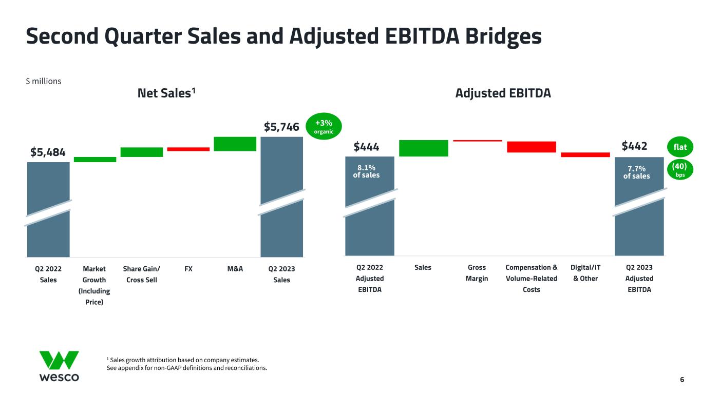 5 Second Quarter Results Overview Record sales highlight the power and benefit of our diversified higher-growth portfolio Q2 2023 Q2 2022 YOY Sales $5,746 $5,484 +3%1 Gross Profit $1,242 $1,189 +4% Gross Margin 21.6% 21.7% (10) bps Adjusted EBITDA $442 $444 flat Adjusted EBITDA Margin 7.7% 8.1% (40) bps Adjusted Diluted EPS $3.71 $4.19 (11)% $ millions, except per share amounts 1 Sales growth shown on an organic basis. 2 Preliminary July sales per workday are not adjusted for differences in foreign exchange rates and include sales related to the Rahi Systems acquisition. See appendix for non-GAAP definitions and reconciliations. • All-time record sales, with record sales in CSS and UBS • Sales impacted by select market weakness in EES • Organic sales +3% YOY, reported sales +5% YOY • Backlog up 6% YOY, down 2% sequentially • Gross margin stable excluding impact from mix shift • $25 million annual run-rate cost reduction actions taken in June will benefit second half • Preliminary July sales per workday up ~3%2 YOY • Second quarter free cash flow 141% of net income • Leverage reduced to 2.8x (lowest level since Anixter acquisition)