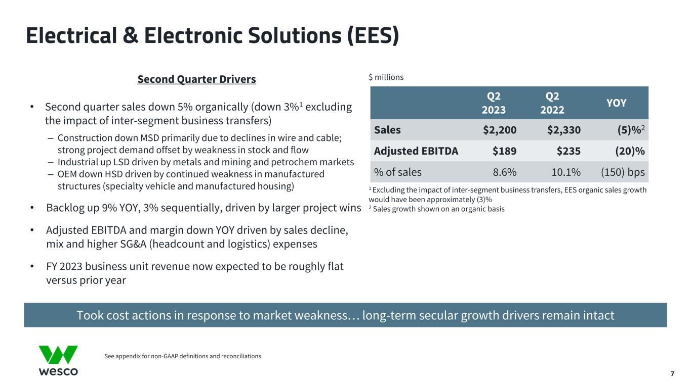 6 Q2 2022 Adjusted EBITDA Sales Gross Margin Compensation & Volume-Related Costs Digital/IT & Other Q2 2023 Adjusted EBITDA Second Quarter Sales and Adjusted EBITDA Bridges $444 $442 6.7% of sales 7.7% of sales $ millions 1 Sales growth attribution based on company estimates. See appendix for non-GAAP definitions and reconciliations. Q2 2022 Sales Market Growth (Including Price) Share Gain/ Cross Sell FX M&A Q2 2023 Sales Net Sales1 Adjusted EBITDA 8.1% of sales flat (40) bps $5,484 $5,746 +3% organic