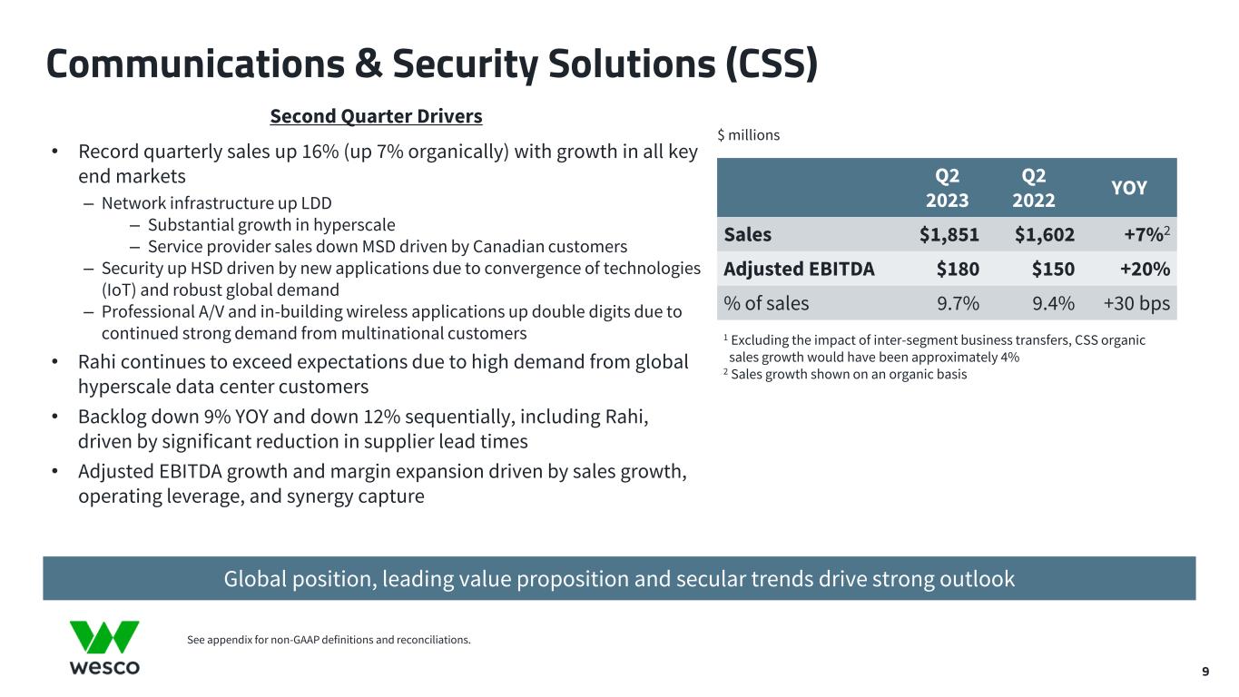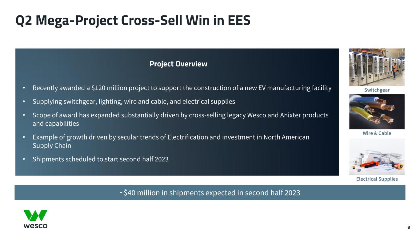 Q2 Mega-Project Cross-Sell Win in EES 8 ~$40 million in shipments expected in second half 2023 Switchgear Wire & Cable Electrical Supplies Project Overview • Recently awarded a $120 million project to support the construction of a new EV manufacturing facility • Supplying switchgear, lighting, wire and cable, and electrical supplies • Scope of award has expanded substantially driven by cross-selling legacy Wesco and Anixter products and capabilities • Example of growth driven by secular trends of Electrification and investment in North American Supply Chain • Shipments scheduled to start second half 2023