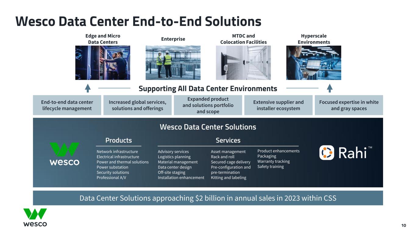 Communications & Security Solutions (CSS) Global position, leading value proposition and secular trends drive strong outlook 9 $ millions Q2 2023 Q2 2022 YOY Sales $1,851 $1,602 +7%2 Adjusted EBITDA $180 $150 +20% % of sales 9.7% 9.4% +30 bps See appendix for non-GAAP definitions and reconciliations. Second Quarter Drivers • Record quarterly sales up 16% (up 7% organically) with growth in all key end markets – Network infrastructure up LDD – Substantial growth in hyperscale – Service provider sales down MSD driven by Canadian customers – Security up HSD driven by new applications due to convergence of technologies (IoT) and robust global demand – Professional A/V and in-building wireless applications up double digits due to continued strong demand from multinational customers • Rahi continues to exceed expectations due to high demand from global hyperscale data center customers • Backlog down 9% YOY and down 12% sequentially, including Rahi, driven by significant reduction in supplier lead times • Adjusted EBITDA growth and margin expansion driven by sales growth, operating leverage, and synergy capture 1 Excluding the impact of inter-segment business transfers, CSS organic sales growth would have been approximately 4% 2 Sales growth shown on an organic basis