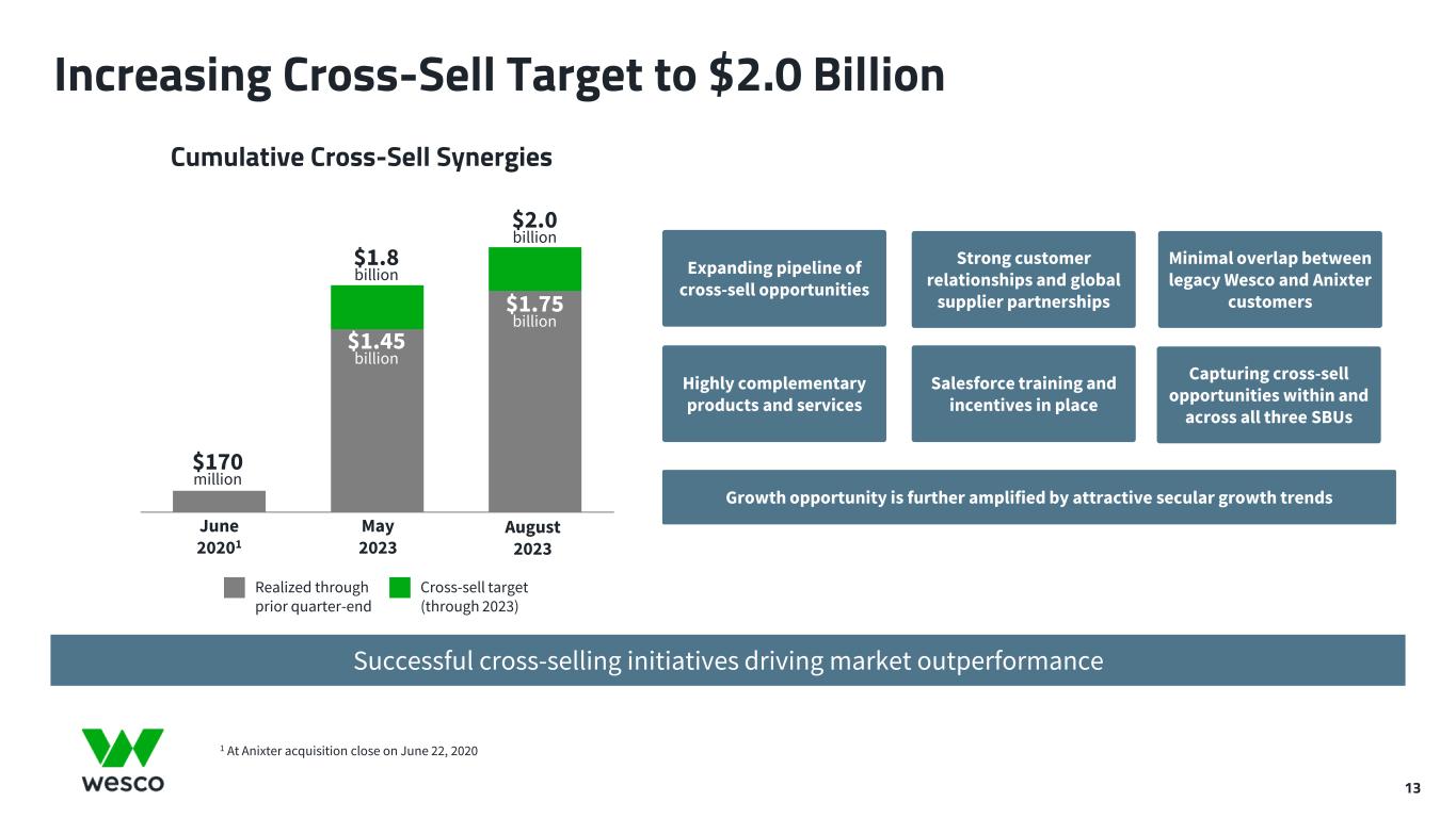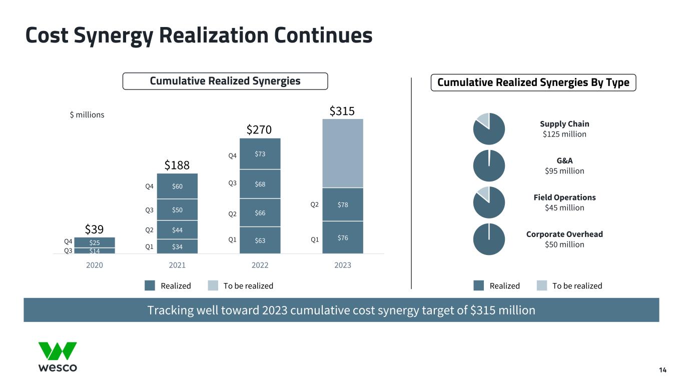 13 June 2020 May 2023 August 2023 Expanding pipeline of cross-sell opportunities Increasing Cross-Sell Target to $2.0 Billion Successful cross-selling initiatives driving market outperformance Cumulative Cross-Sell Synergies $1.45 billion Realized through prior quarter-end Cross-sell target (through 2023) Strong customer relationships and global supplier partnerships Minimal overlap between legacy Wesco and Anixter customers Highly complementary products and services Salesforce training and incentives in place Capturing cross-sell opportunities within and across all three SBUs Growth opportunity is further amplified by attractive secular growth trends $2.0 billion $1.75 billion $170 million June 20201 August 2023 1 At Anixter acquisition close on June 22, 2020 $1.8 billion May 2023