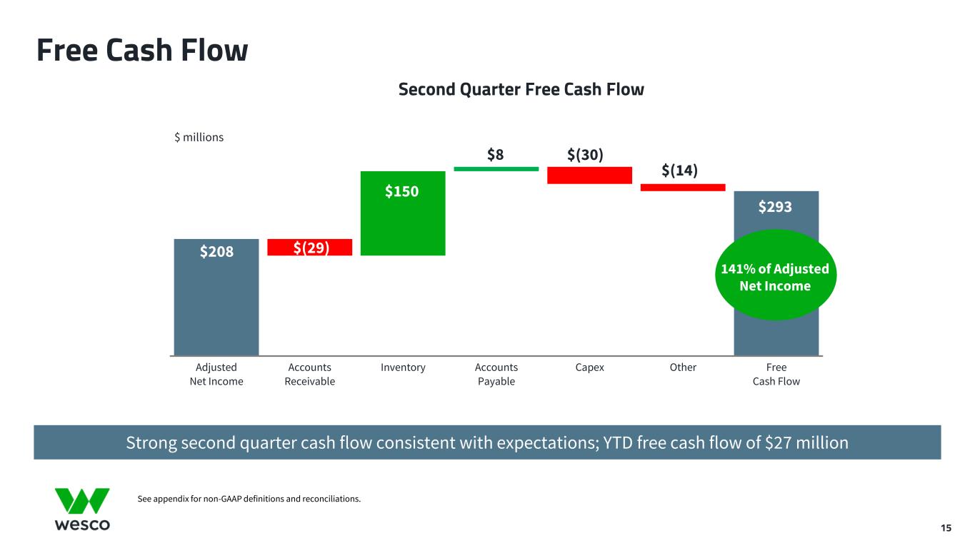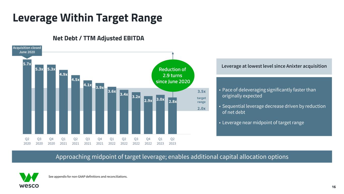 15 Free Cash Flow Strong second quarter cash flow consistent with expectations; YTD free cash flow of $27 million $ millions See appendix for non-GAAP definitions and reconciliations. Second Quarter Free Cash Flow Adjusted Net Income Accounts Receivable Inventory Accounts Payable Capex Other Free Cash Flow $(30)$8 $208 $(29) $150 $293 $(14) 141% of Adjusted Net Income