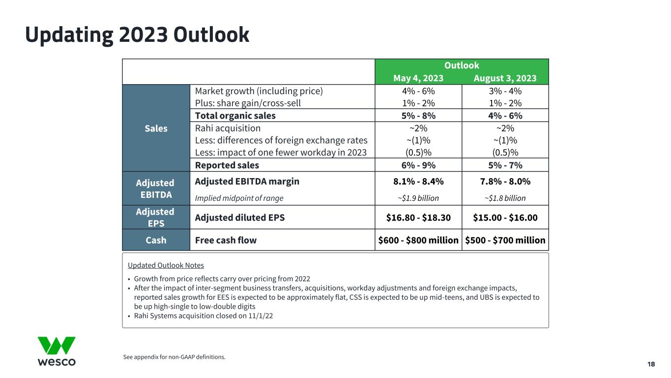 a • Leading Portfolio of Products, Services, and Solutions • Leading Positions in All SBUs • Global Footprint and Capabilities • Digital Investments Unlocking the Value of Our Big Data • Accelerating Consolidation Across the Value Chain Electrification Automation and IoT Green Energy and Grid Modernization 24/7 Connectivity and Security Digitalization and AI Supply Chain Consolidation and Relocation to North America Attractive Long-Term Growth Drivers + Wesco’s Uniquely Strong Position Increasing Public Sector Investment U.S. Infrastructure Bills Public-Private Partnerships for Smart Cities Rural Digital Opportunity Fund (RDOF) Canada Broadband Investments Secular Growth Trends + 17 Wesco is uniquely positioned for sustainable long-term growth