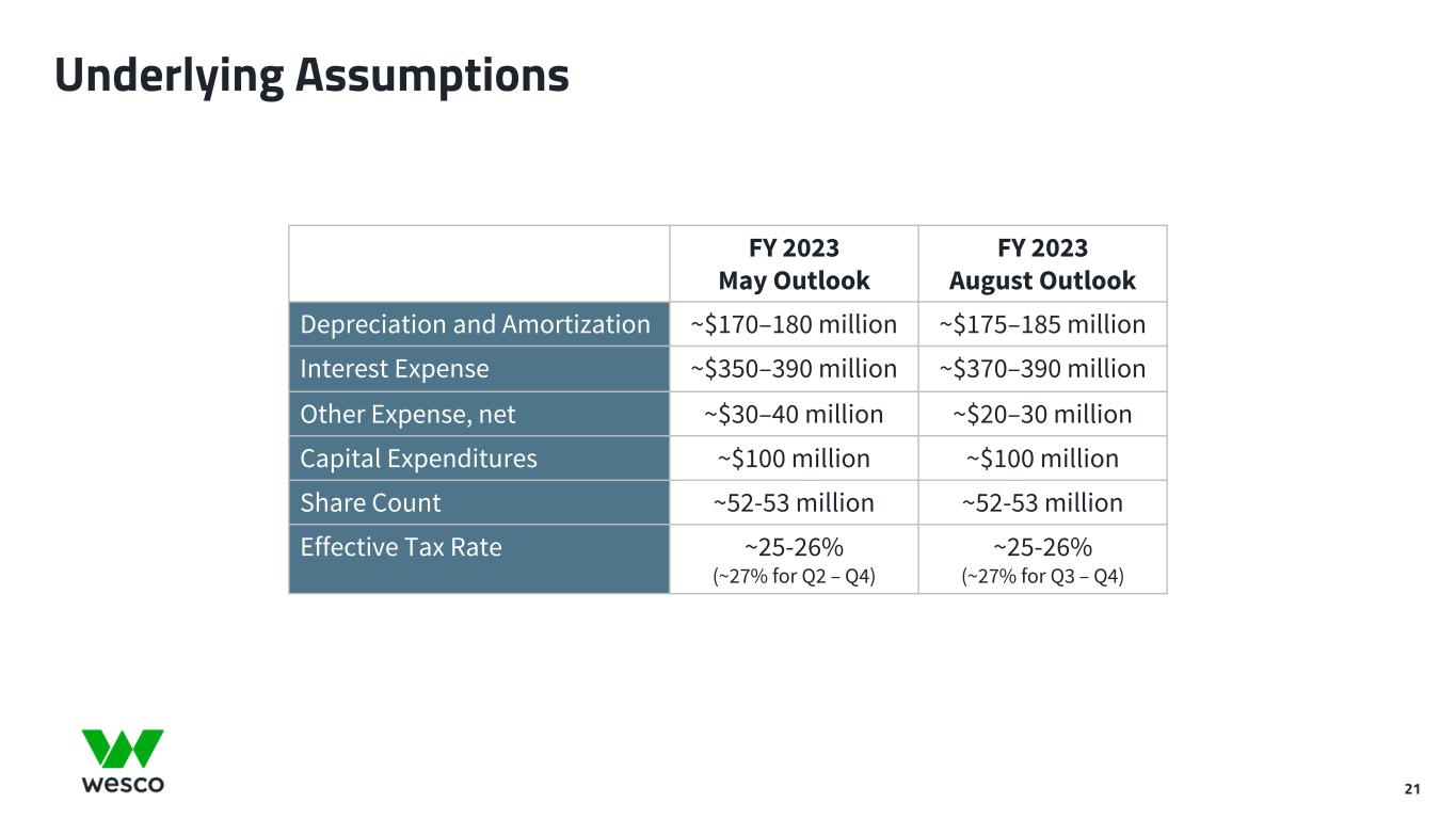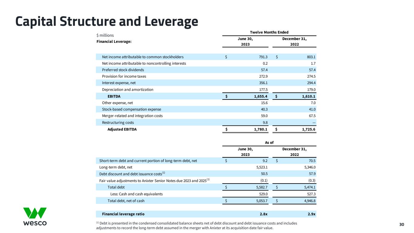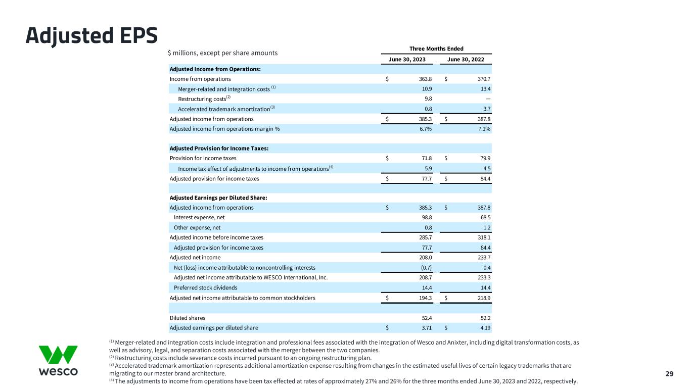 June 30, 2023 June 30, 2022 Adjusted Income from Operations: Income from operations $ 363.8 $ 370.7 Merger-related and integration costs (1) 10.9 13.4 Restructuring costs(2) 9.8 — Accelerated trademark amortization(3) 0.8 3.7 Adjusted income from operations $ 385.3 $ 387.8 Adjusted income from operations margin % 6.7% 7.1% Adjusted Provision for Income Taxes: Provision for income taxes $ 71.8 $ 79.9 Income tax effect of adjustments to income from operations(4) 5.9 4.5 Adjusted provision for income taxes $ 77.7 $ 84.4 Adjusted Earnings per Diluted Share: Adjusted income from operations $ 385.3 $ 387.8 Interest expense, net 98.8 68.5 Other expense, net 0.8 1.2 Adjusted income before income taxes 285.7 318.1 Adjusted provision for income taxes 77.7 84.4 Adjusted net income 208.0 233.7 Net (loss) income attributable to noncontrolling interests (0.7) 0.4 Adjusted net income attributable to WESCO International, Inc. 208.7 233.3 Preferred stock dividends 14.4 14.4 Adjusted net income attributable to common stockholders $ 194.3 $ 218.9 Diluted shares 52.4 52.2 Adjusted earnings per diluted share $ 3.71 $ 4.19 Three Months Ended Adjusted EPS 29 $ millions, except per share amounts (1) Merger-related and integration costs include integration and professional fees associated with the integration of Wesco and Anixter, including digital transformation costs, as well as advisory, legal, and separation costs associated with the merger between the two companies. (2) Restructuring costs include severance costs incurred pursuant to an ongoing restructuring plan. (3) Accelerated trademark amortization represents additional amortization expense resulting from changes in the estimated useful lives of certain legacy trademarks that are migrating to our master brand architecture. (4) The adjustments to income from operations have been tax effected at rates of approximately 27% and 26% for the three months ended June 30, 2023 and 2022, respectively.