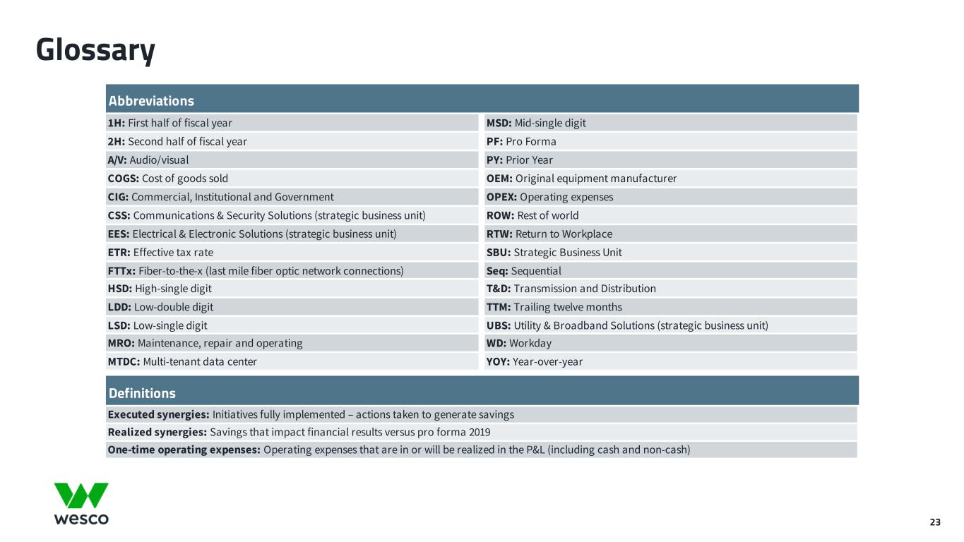 23 Glossary Abbreviations 1H: First half of fiscal year MSD: Mid-single digit 2H: Second half of fiscal year PF: Pro Forma A/V: Audio/visual PY: Prior Year COGS: Cost of goods sold OEM: Original equipment manufacturer CIG: Commercial, Institutional and Government OPEX: Operating expenses CSS: Communications & Security Solutions (strategic business unit) ROW: Rest of world EES: Electrical & Electronic Solutions (strategic business unit) RTW: Return to Workplace ETR: Effective tax rate SBU: Strategic Business Unit FTTx: Fiber-to-the-x (last mile fiber optic network connections)   Seq: Sequential HSD: High-single digit T&D: Transmission and Distribution LDD: Low-double digit TTM: Trailing twelve months LSD: Low-single digit UBS: Utility & Broadband Solutions (strategic business unit) MRO: Maintenance, repair and operating WD: Workday MTDC: Multi-tenant data center YOY: Year-over-year Definitions Executed synergies: Initiatives fully implemented – actions taken to generate savings Realized synergies: Savings that impact financial results versus pro forma 2019 One-time operating expenses: Operating expenses that are in or will be realized in the P&L (including cash and non-cash)