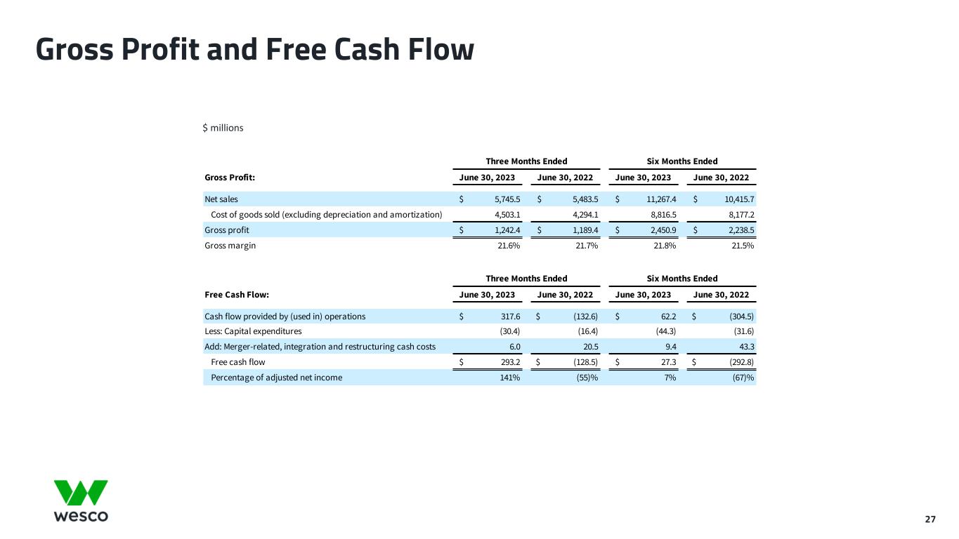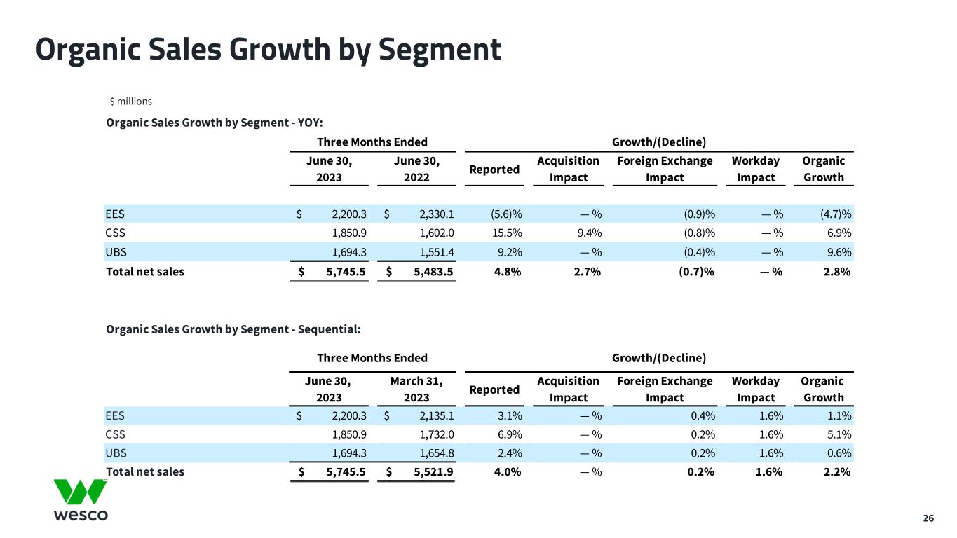 26 Organic Sales Growth by Segment $ millions June 30, 2023 June 30, 2022 Reported Acquisition Impact Foreign Exchange Impact Workday Impact Organic Growth EES $ 2,200.3 $ 2,330.1 (5.6)% — % (0.9)% — % (4.7)% CSS 1,850.9 1,602.0 15.5% 9.4% (0.8)% — % 6.9% UBS 1,694.3 1,551.4 9.2% — % (0.4)% — % 9.6% Total net sales $ 5,745.5 $ 5,483.5 4.8% 2.7% (0.7)% — % 2.8% June 30,  2023 March 31, 2023 Reported Acquisition Impact Foreign Exchange Impact Workday Impact Organic  Growth EES $ 2,200.3 $ 2,135.1 3.1% — % 0.4% 1.6% 1.1% CSS 1,850.9 1,732.0 6.9% — % 0.2% 1.6% 5.1% UBS 1,694.3 1,654.8 2.4% — % 0.2% 1.6% 0.6% Total net sales $ 5,745.5 $ 5,521.9 4.0% — % 0.2% 1.6% 2.2% Organic Sales Growth by Segment - YOY: Three Months Ended Growth/(Decline) Organic Sales Growth by Segment - Sequential: Three Months Ended Growth/(Decline)
