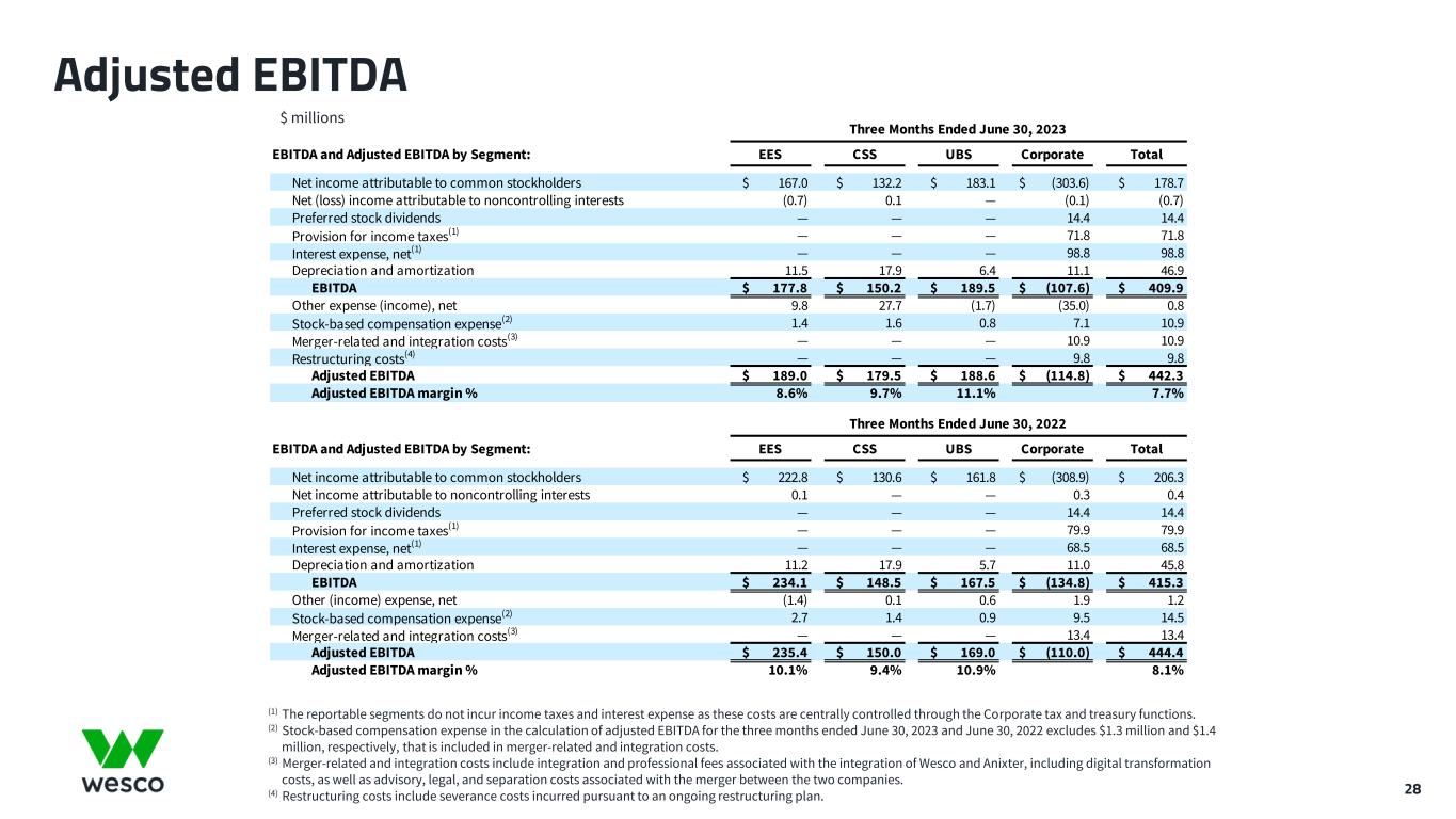 28 Adjusted EBITDA $ millions (1) The reportable segments do not incur income taxes and interest expense as these costs are centrally controlled through the Corporate tax and treasury functions. (2) Stock-based compensation expense in the calculation of adjusted EBITDA for the three months ended June 30, 2023 and June 30, 2022 excludes $1.3 million and $1.4 million, respectively, that is included in merger-related and integration costs. (3) Merger-related and integration costs include integration and professional fees associated with the integration of Wesco and Anixter, including digital transformation costs, as well as advisory, legal, and separation costs associated with the merger between the two companies. (4) Restructuring costs include severance costs incurred pursuant to an ongoing restructuring plan. EBITDA and Adjusted EBITDA by Segment: EES CSS UBS Corporate Total Net income attributable to common stockholders $ 167.0 $ 132.2 $ 183.1 $ (303.6) $ 178.7 Net (loss) income attributable to noncontrolling interests (0.7) 0.1 — (0.1) (0.7) Preferred stock dividends — — — 14.4 14.4 Provision for income taxes(1) — — — 71.8 71.8 Interest expense, net(1) — — — 98.8 98.8 Depreciation and amortization 11.5 17.9 6.4 11.1 46.9 EBITDA $ 177.8 $ 150.2 $ 189.5 $ (107.6) $ 409.9 Other expense (income), net 9.8 27.7 (1.7) (35.0) 0.8 Stock-based compensation expense(2) 1.4 1.6 0.8 7.1 10.9 Merger-related and integration costs(3) — — — 10.9 10.9 Restructuring costs(4) — — — 9.8 9.8 Adjusted EBITDA $ 189.0 $ 179.5 $ 188.6 $ (114.8) $ 442.3 Adjusted EBITDA margin % 8.6% 9.7% 11.1% 7.7% EBITDA and Adjusted EBITDA by Segment: EES CSS UBS Corporate Total Net income attributable to common stockholders $ 222.8 $ 130.6 $ 161.8 $ (308.9) $ 206.3 Net income attributable to noncontrolling interests 0.1 — — 0.3 0.4 Preferred stock dividends — — — 14.4 14.4 Provision for income taxes(1) — — — 79.9 79.9 Interest expense, net(1) — — — 68.5 68.5 Depreciation and amortization 11.2 17.9 5.7 11.0 45.8 EBITDA $ 234.1 $ 148.5 $ 167.5 $ (134.8) $ 415.3 Other (income) expense, net (1.4) 0.1 0.6 1.9 1.2 Stock-based compensation expense(2) 2.7 1.4 0.9 9.5 14.5 Merger-related and integration costs(3) — — — 13.4 13.4 Adjusted EBITDA $ 235.4 $ 150.0 $ 169.0 $ (110.0) $ 444.4 Adjusted EBITDA margin % 10.1% 9.4% 10.9% 8.1% Three Months Ended June 30, 2023 Three Months Ended June 30, 2022