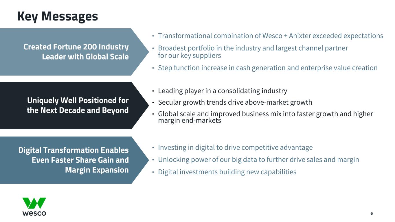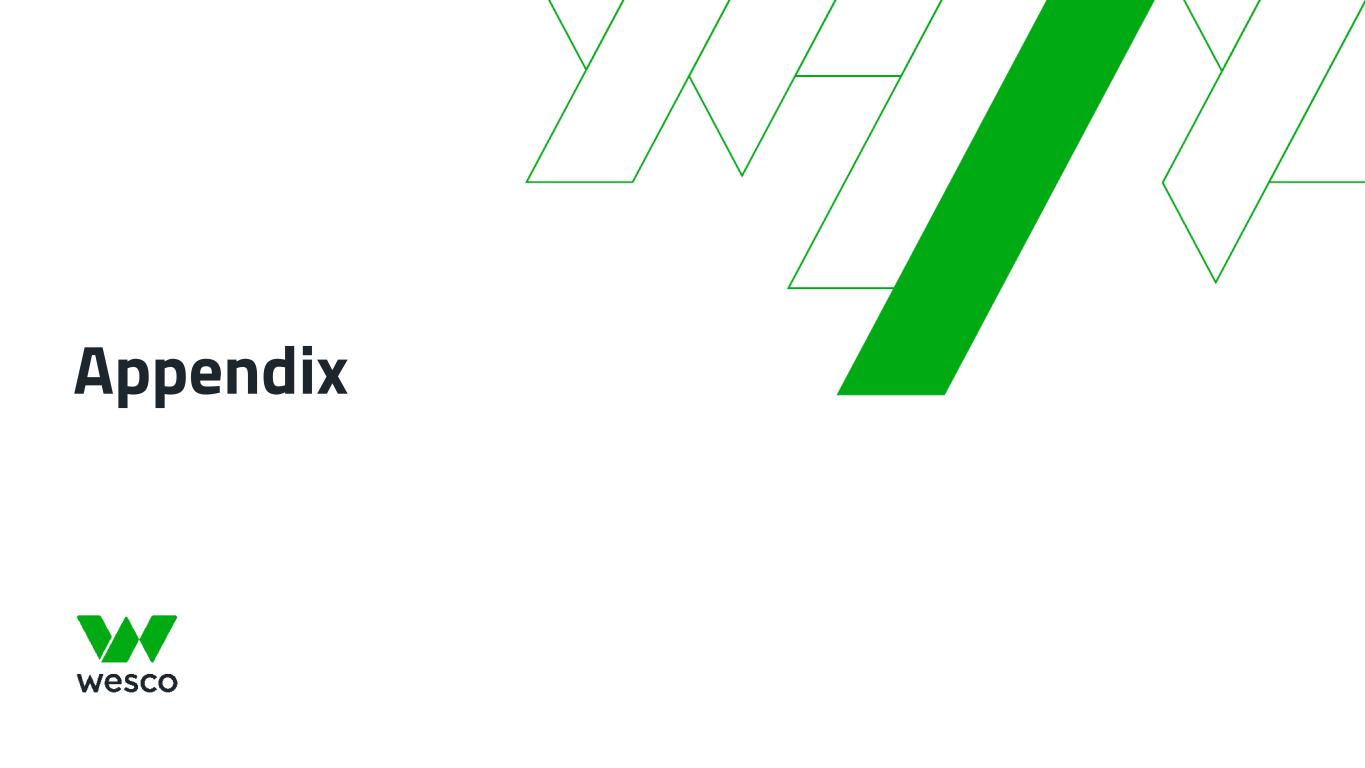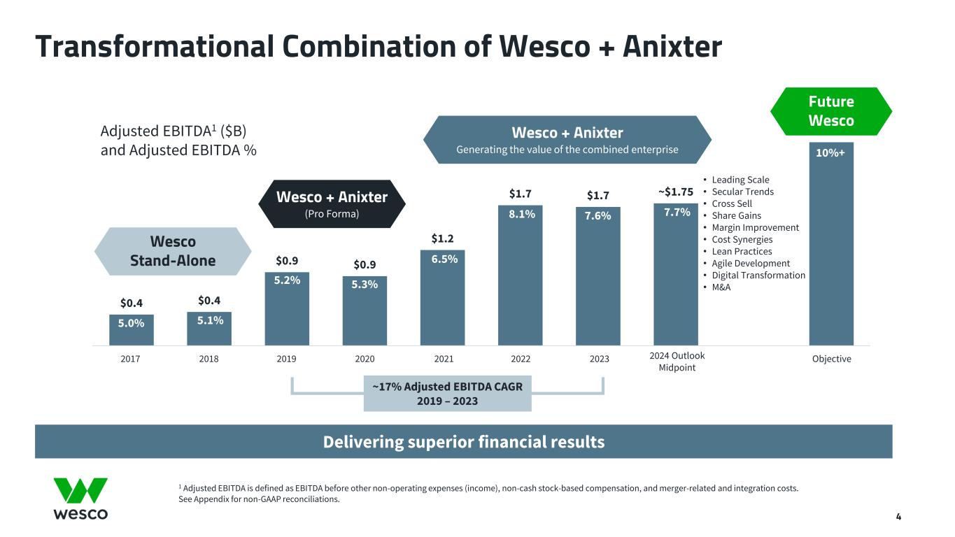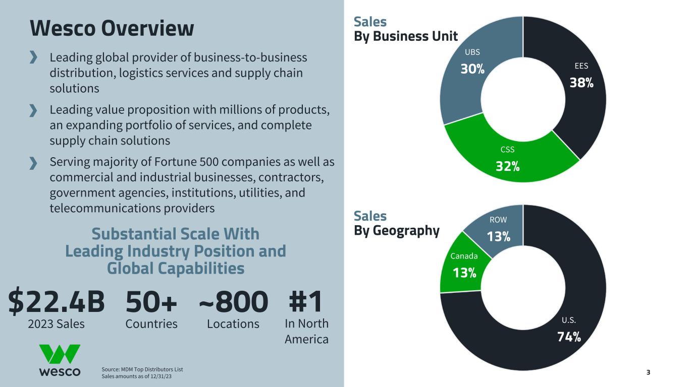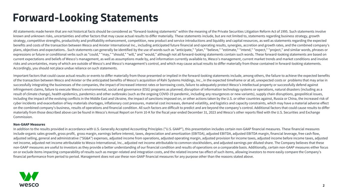 All statements made herein that are not historical facts should be considered as “forward-looking statements” within the meaning of the Private Securities Litigation Reform Act of 1995. Such statements involve known and unknown risks, uncertainties and other factors that may cause actual results to differ materially. These statements include, but are not limited to, statements regarding business strategy, growth strategy, competitive strengths, productivity and profitability enhancement, competition, new product and service introductions and liquidity and capital resources, as well as statements regarding the expected benefits and costs of the transaction between Wesco and Anixter International Inc., including anticipated future financial and operating results, synergies, accretion and growth rates, and the combined company's plans, objectives and expectations.. Such statements can generally be identified by the use of words such as "anticipate," "plan," "believe," "estimate," "intend," "expect," "project," and similar words, phrases or expressions or future or conditional verbs such as "could," "may," "should," "will," and "would,” although not all forward-looking statements contain such words. These forward-looking statements are based on current expectations and beliefs of Wesco's management, as well as assumptions made by, and information currently available to, Wesco's management, current market trends and market conditions and involve risks and uncertainties, many of which are outside of Wesco's and Wesco's management's control, and which may cause actual results to differ materially from those contained in forward-looking statements. Accordingly, you should not place undue reliance on such statements. Important factors that could cause actual results or events to differ materially from those presented or implied in the forward-looking statements include, among others, the failure to achieve the expected benefits of the transaction between Wesco and Anixter or the anticipated benefits of Wesco’s acquisition of Rahi Systems Holdings, Inc., in the expected timeframe or at all, unexpected costs or problems that may arise in successfully integrating the businesses of the companies, the impact of increased interest rates or borrowing costs, failure to adequately protect Wesco’s intellectual property or successfully defend against infringement claims, failure to execute Wesco’s environmental, social and governance (ESG) programs as planned; disruption of information technology systems or operations, natural disasters (including as a result of climate change), health epidemics, pandemics and other outbreaks (such as the ongoing COVID-19 pandemic, including any resurgences or new variants), supply chain disruptions, geopolitical issues, including the impact of the evolving conflicts in the Middle East and Ukraine, the impact of sanctions imposed on, or other actions taken by the U.S. or other countries against, Russia or China, the increased risk of cyber incidents and exacerbation of key materials shortages, inflationary cost pressures, material cost increases, demand volatility, and logistics and capacity constraints, which may have a material adverse effect on the combined company's business, results of operations and financial condition. All such factors are difficult to predict and are beyond the company's control. Additional factors that could cause results to differ materially from those described above can be found in Wesco's Annual Report on Form 10-K for the fiscal year ended December 31, 2023 and Wesco's other reports filed with the U.S. Securities and Exchange Commission. Non-GAAP Measures In addition to the results provided in accordance with U.S. Generally Accepted Accounting Principles ("U.S. GAAP"), this presentation includes certain non-GAAP financial measures. These financial measures include organic sales growth, gross profit, gross margin, earnings before interest, taxes, depreciation and amortization (EBITDA), adjusted EBITDA, adjusted EBITDA margin, financial leverage, free cash flow, adjusted selling, general and administrative (“SG&A”) expenses, adjusted income from operations, adjusted operating margin, adjusted provision for income taxes, adjusted income before income taxes, adjusted net income, adjusted net income attributable to Wesco International, Inc., adjusted net income attributable to common stockholders, and adjusted earnings per diluted share. The Company believes that these non-GAAP measures are useful to investors as they provide a better understanding of our financial condition and results of operations on a comparable basis. Additionally, certain non-GAAP measures either focus on or exclude items impacting comparability of results such as merger-related and integration costs, and the related income tax effect of such items, allowing investors to more easily compare the Company's financial performance from period to period. Management does not use these non-GAAP financial measures for any purpose other than the reasons stated above. Forward-Looking Statements 2
