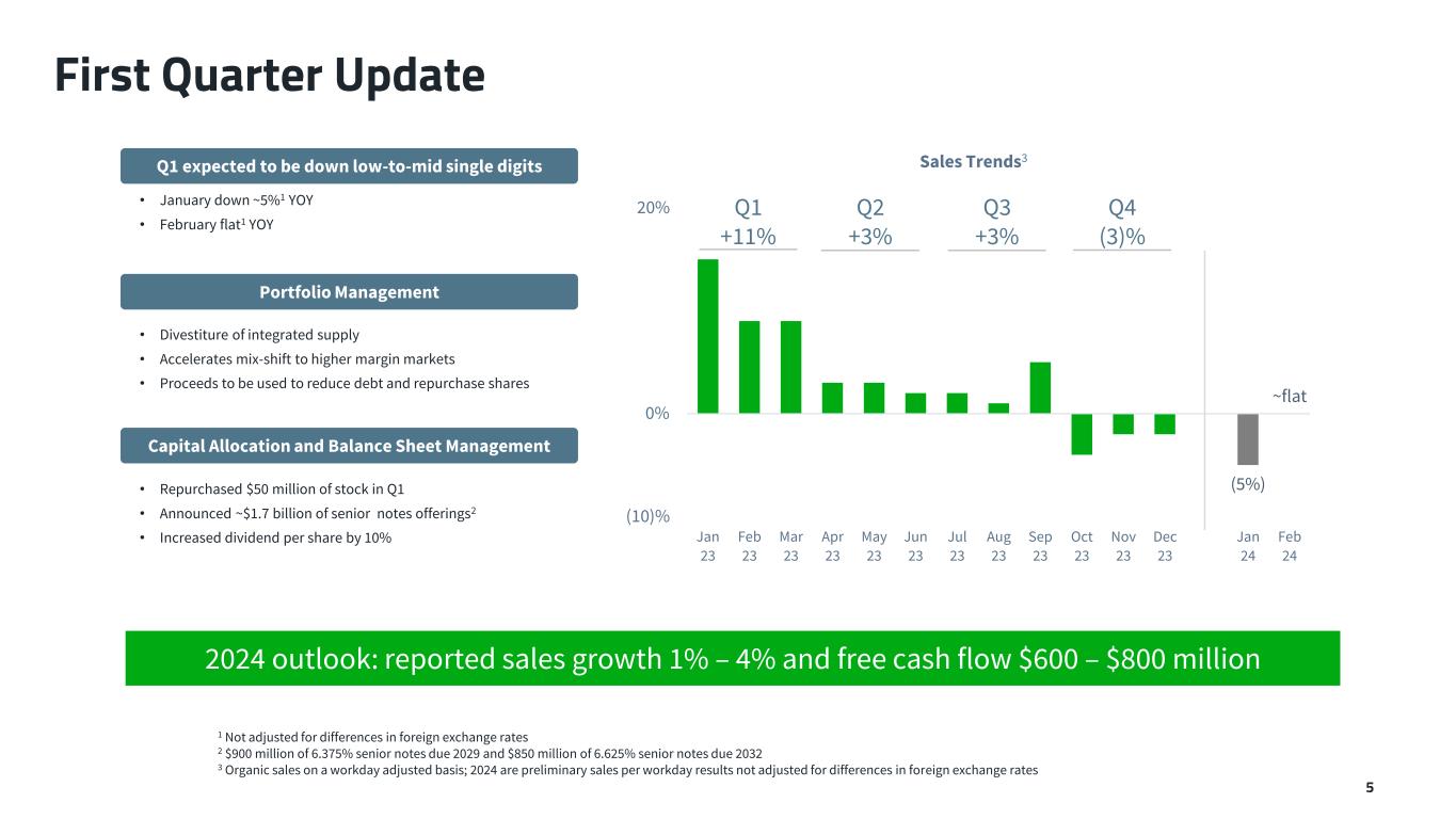 First Quarter Update 5 2024 outlook: reported sales growth 1% – 4% and free cash flow $600 – $800 million • January down ~5%1 YOY • February flat1 YOY • Divestiture of integrated supply • Accelerates mix-shift to higher margin markets • Proceeds to be used to reduce debt and repurchase shares • Repurchased $50 million of stock in Q1 • Announced ~$1.7 billion of senior notes offerings2 • Increased dividend per share by 10% Capital Allocation and Balance Sheet Management (5%) ~flat (10)% 20% Jan 23 Feb 23 Mar 23 Apr 23 May 23 Jun 23 Jul 23 Aug 23 Sep 23 Oct 23 Nov 23 Dec 23 Jan 24 Feb 24 Sales Trends3 Portfolio Management Q1 expected to be down low-to-mid single digits 0% 1 Not adjusted for differences in foreign exchange rates 2 $900 million of 6.375% senior notes due 2029 and $850 million of 6.625% senior notes due 2032 3 Organic sales on a workday adjusted basis; 2024 are preliminary sales per workday results not adjusted for differences in foreign exchange rates Q1 +11% Q2 +3% Q3 +3% Q4 (3)%