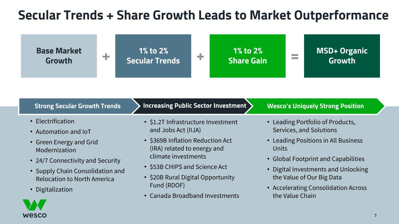 6 Key Messages • Transformational combination of Wesco + Anixter exceeded expectations • Broadest portfolio in the industry and largest channel partner for our key suppliers • Step function increase in cash generation and enterprise value creation • Leading player in a consolidating industry • Secular growth trends drive above-market growth • Global scale and improved business mix into faster growth and higher margin end-markets • Investing in digital to drive competitive advantage • Unlocking power of our big data to further drive sales and margin • Digital investments building new capabilities Created Fortune 200 Industry Leader with Global Scale Uniquely Well Positioned for the Next Decade and Beyond Digital Transformation Enables Even Faster Share Gain and Margin Expansion