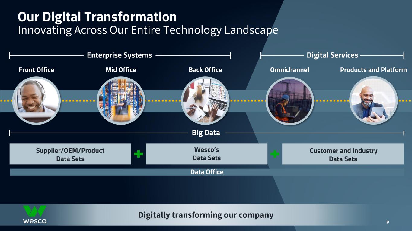 7 • $1.2T Infrastructure Investment and Jobs Act (IIJA) • $369B Inflation Reduction Act (IRA) related to energy and climate investments • $53B CHIPS and Science Act • $20B Rural Digital Opportunity Fund (RDOF) • Canada Broadband Investments • Leading Portfolio of Products, Services, and Solutions • Leading Positions in All Business Units • Global Footprint and Capabilities • Digital Investments and Unlocking the Value of Our Big Data • Accelerating Consolidation Across the Value Chain MSD+ Organic Growth 1% to 2% Secular Trends 1% to 2% Share Gain Base Market Growth =+ + • Electrification • Automation and IoT • Green Energy and Grid Modernization • 24/7 Connectivity and Security • Supply Chain Consolidation and Relocation to North America • Digitalization Secular Trends + Share Growth Leads to Market Outperformance Strong Secular Growth Trends Wesco’s Uniquely Strong PositionIncreasing Public Sector Investment