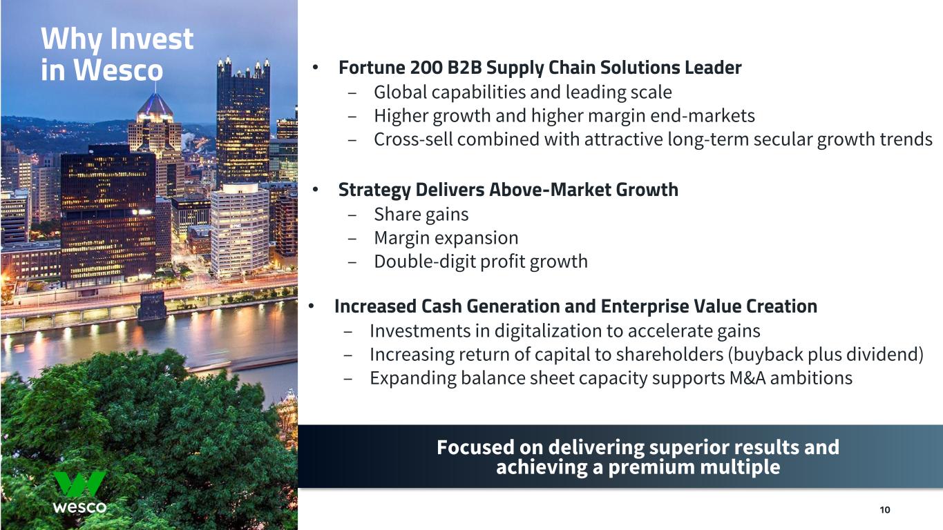 9 Annual Value Creation Framework = Invest for Above Market Growth Increase Return of Capital to Shareholders and Reduce Leverage Long-term Growth MSD+ Organic Sales Growth ~14% Incremental EBITDA1 Margin Margin Expansion 2x Sales Growth Sustainable Cash Flow Generation Over the Long Term EBITDA Growth + 1 Adjusted EBITDA is defined as EBITDA before other non-operating expenses (income), non-cash stock-based compensation, and merger-related and integration costs. Virtuous cycle of value creation for Wesco
