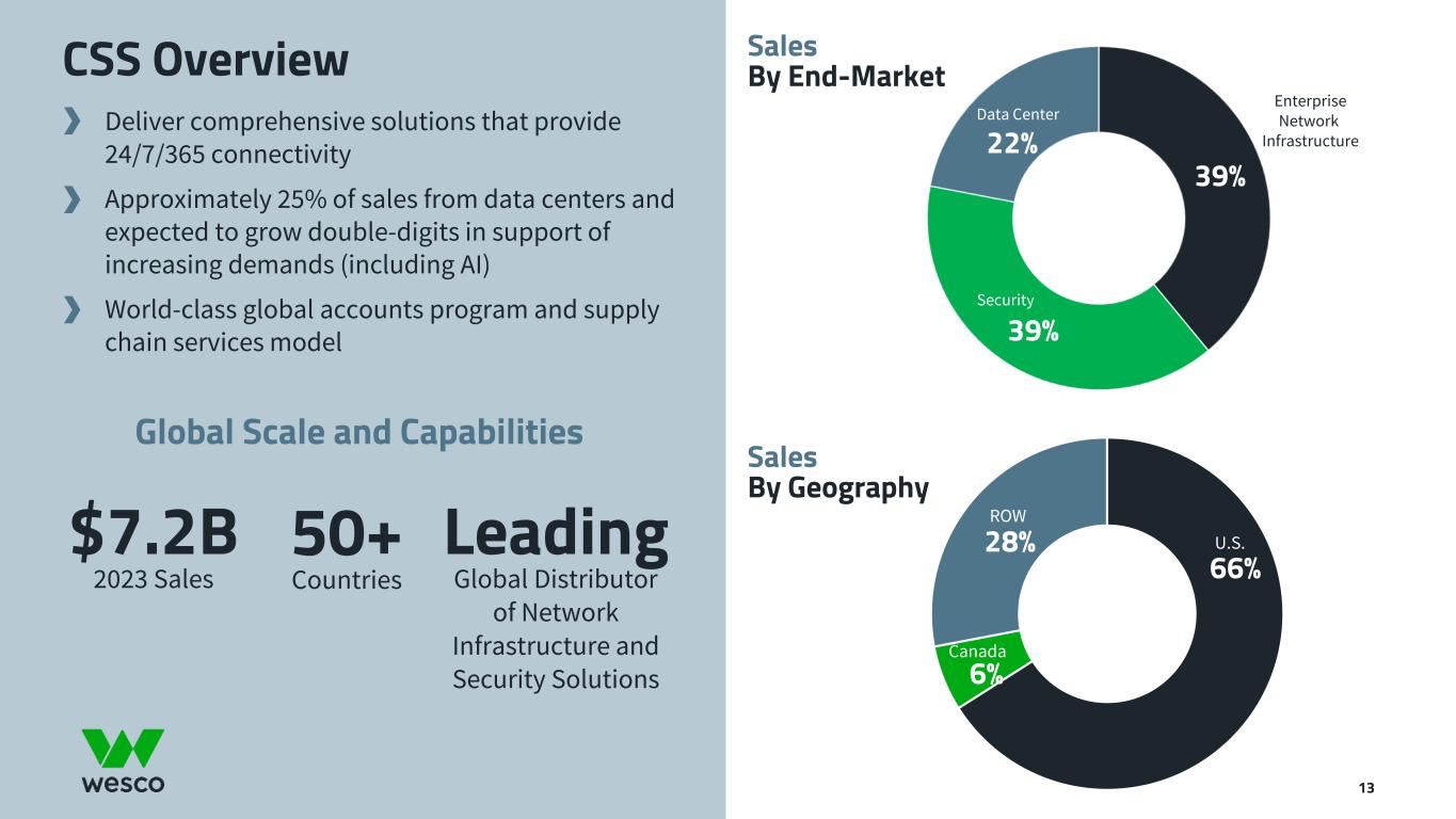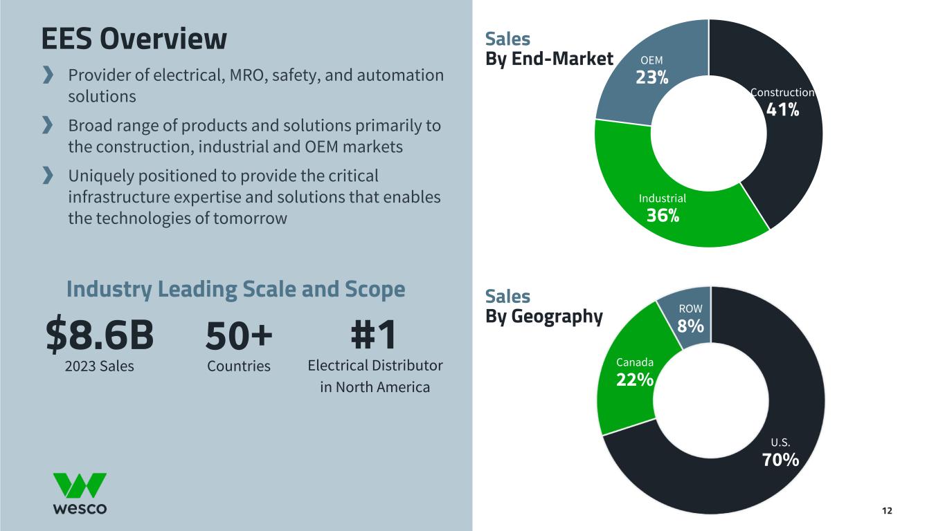 U.S. 70% Canada 22% ROW 8% Construction 41% Industrial 36% OEM 23% Sales By End-Market Sales By Geography Provider of electrical, MRO, safety, and automation solutions Broad range of products and solutions primarily to the construction, industrial and OEM markets Uniquely positioned to provide the critical infrastructure expertise and solutions that enables the technologies of tomorrow EES Overview $8.6B 2023 Sales 50+ Countries Industry Leading Scale and Scope #1 Electrical Distributor in North America 12