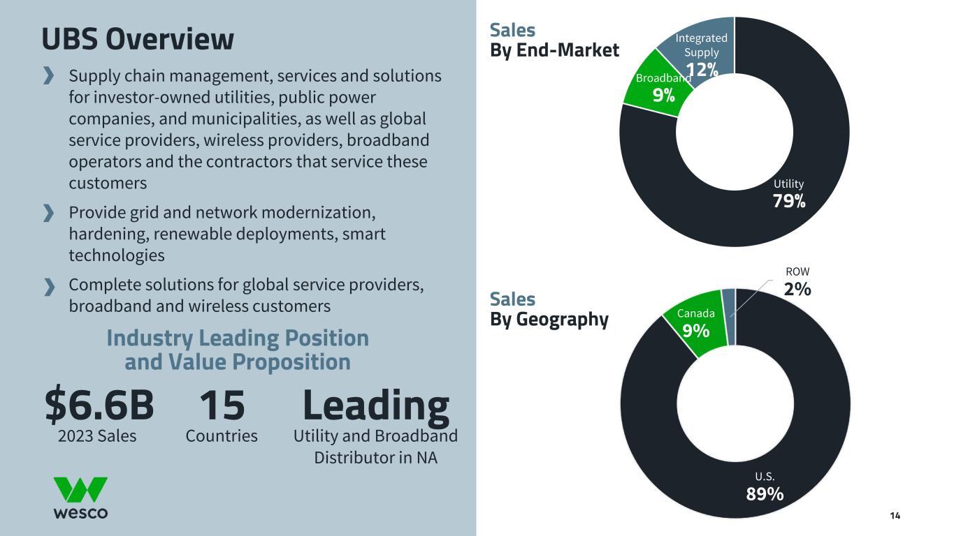 U.S. 89% Canada 9% ROW 2% UBS Overview Sales By End-Market Sales By Geography Supply chain management, services and solutions for investor-owned utilities, public power companies, and municipalities, as well as global service providers, wireless providers, broadband operators and the contractors that service these customers Provide grid and network modernization, hardening, renewable deployments, smart technologies Complete solutions for global service providers, broadband and wireless customers $6.6B 2023 Sales 15 Countries Industry Leading Position and Value Proposition Leading Utility and Broadband Distributor in NA Utility 79% Broadband 9% 12% Integrated Supply 14