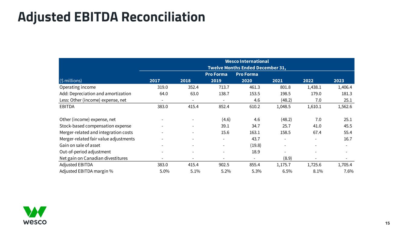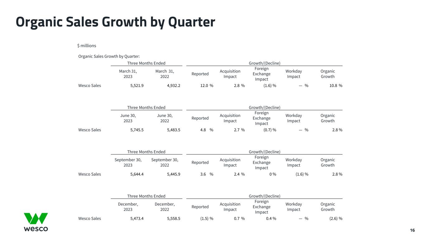 Adjusted EBITDA Reconciliation 15 Wesco International Twelve Months Ended December 31, Pro Forma Pro Forma ($ millions) 2017 2018 2019 2020 2021 2022 2023 Operating income 319.0 352.4 713.7 461.3 801.8 1,438.1 1,406.4 Add: Depreciation and amortization 64.0 63.0 138.7 153.5 198.5 179.0 181.3 Less: Other (income) expense, net - - - 4.6 (48.2) 7.0 25.1 EBITDA 383.0 415.4 852.4 610.2 1,048.5 1,610.1 1,562.6 Other (income) expense, net - - (4.6) 4.6 (48.2) 7.0 25.1 Stock-based compensation expense - - 39.1 34.7 25.7 41.0 45.5 Merger-related and integration costs - - 15.6 163.1 158.5 67.4 55.4 Merger-related fair value adjustments - - - 43.7 - - 16.7 Gain on sale of asset - - - (19.8) - - - Out-of-period adjustment - - - 18.9 - - - Net gain on Canadian divestitures - - - - (8.9) - - Adjusted EBITDA 383.0 415.4 902.5 855.4 1,175.7 1,725.6 1,705.4 Adjusted EBITDA margin % 5.0% 5.1% 5.2% 5.3% 6.5% 8.1% 7.6%
