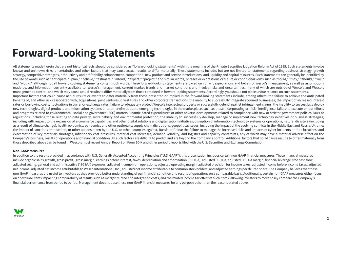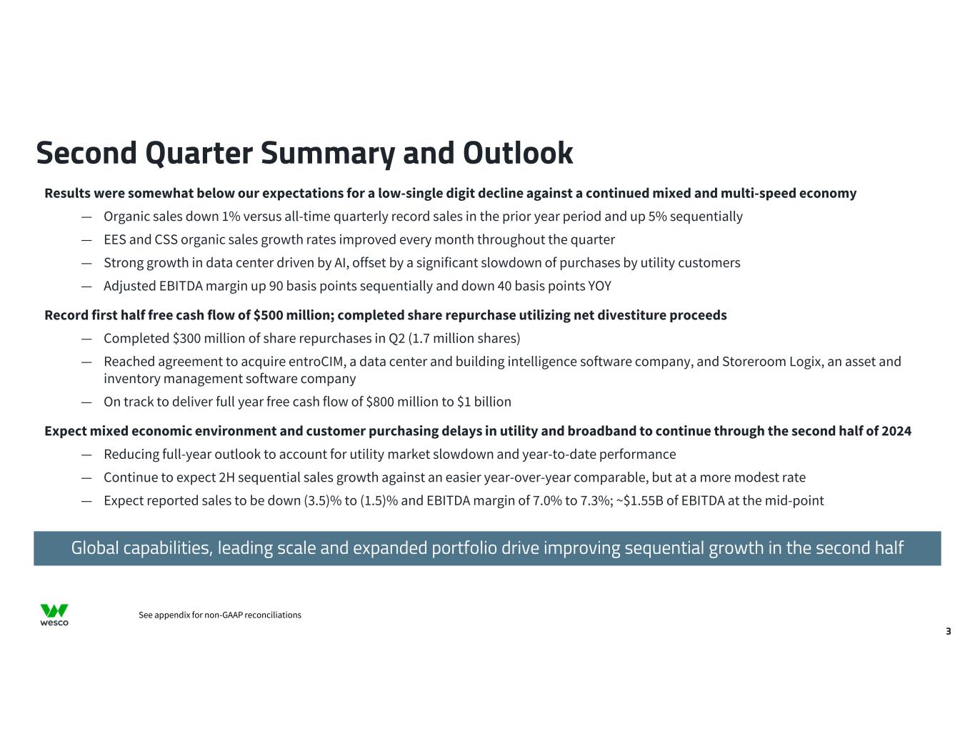 2 All statements made herein that are not historical facts should be considered as "forward-looking statements" within the meaning of the Private Securities Litigation Reform Act of 1995. Such statements involve known and unknown risks, uncertainties and other factors that may cause actual results to differ materially. These statements include, but are not limited to, statements regarding business strategy, growth strategy, competitive strengths, productivity and profitability enhancement, competition, new product and service introductions, and liquidity and capital resources. Such statements can generally be identified by the use of words such as "anticipate," "plan," "believe," "estimate," "intend," "expect," "project," and similar words, phrases or expressions or future or conditional verbs such as "could," "may," "should," "will," and "would," although not all forward-looking statements contain such words. These forward-looking statements are based on current expectations and beliefs of Wesco's management, as well as assumptions made by, and information currently available to, Wesco's management, current market trends and market conditions and involve risks and uncertainties, many of which are outside of Wesco's and Wesco's management's control, and which may cause actual results to differ materially from those contained in forward-looking statements. Accordingly, you should not place undue reliance on such statements. Important factors that could cause actual results or events to differ materially from those presented or implied in the forward-looking statements include, among others, the failure to achieve the anticipated benefits of, and other risks associated with, acquisitions, joint ventures, divestitures and other corporate transactions; the inability to successfully integrate acquired businesses; the impact of increased interest rates or borrowing costs; fluctuations in currency exchange rates; failure to adequately protect Wesco's intellectual property or successfully defend against infringement claims; the inability to successfully deploy new technologies, digital products and information systems or to otherwise adapt to emerging technologies in the marketplace, such as those incorporating artificial intelligence; failure to execute on our efforts and programs related to environmental, social and governance (ESG) matters; unanticipated expenditures or other adverse developments related to compliance with new or stricter government policies, laws or regulations, including those relating to data privacy, sustainability and environmental protection; the inability to successfully develop, manage or implement new technology initiatives or business strategies, including with respect to the expansion of e-commerce capabilities and other digital solutions and digitalization initiatives; disruption of information technology systems or operations; natural disasters (including as a result of climate change), health epidemics, pandemics and other outbreaks; supply chain disruptions; geopolitical issues, including the impact of the evolving conflicts in the Middle East and Russia/Ukraine; the impact of sanctions imposed on, or other actions taken by the U.S. or other countries against, Russia or China; the failure to manage the increased risks and impacts of cyber incidents or data breaches; and exacerbation of key materials shortages, inflationary cost pressures, material cost increases, demand volatility, and logistics and capacity constraints, any of which may have a material adverse effect on the Company's business, results of operations and financial condition. All such factors are difficult to predict and are beyond the Company's control. Additional factors that could cause results to differ materially from those described above can be found in Wesco's most recent Annual Report on Form 10-K and other periodic reports filed with the U.S. Securities and Exchange Commission. Non-GAAP Measures In addition to the results provided in accordance with U.S. Generally Accepted Accounting Principles ("U.S. GAAP"), this presentation includes certain non-GAAP financial measures. These financial measures include organic sales growth, gross profit, gross margin, earnings before interest, taxes, depreciation and amortization (EBITDA), adjusted EBITDA, adjusted EBITDA margin, financial leverage, free cash flow, adjusted selling, general and administrative (“SG&A”) expenses, adjusted income from operations, adjusted operating margin, adjusted provision for income taxes, adjusted income before income taxes, adjusted net income, adjusted net income attributable to Wesco International, Inc., adjusted net income attributable to common stockholders, and adjusted earnings per diluted share. The Company believes that these non-GAAP measures are useful to investors as they provide a better understanding of our financial condition and results of operations on a comparable basis. Additionally, certain non-GAAP measures either focus on or exclude items impacting comparability of results such as merger-related and integration costs, and the related income tax effect of such items, allowing investors to more easily compare the Company's financial performance from period to period. Management does not use these non-GAAP financial measures for any purpose other than the reasons stated above. Forward-Looking Statements