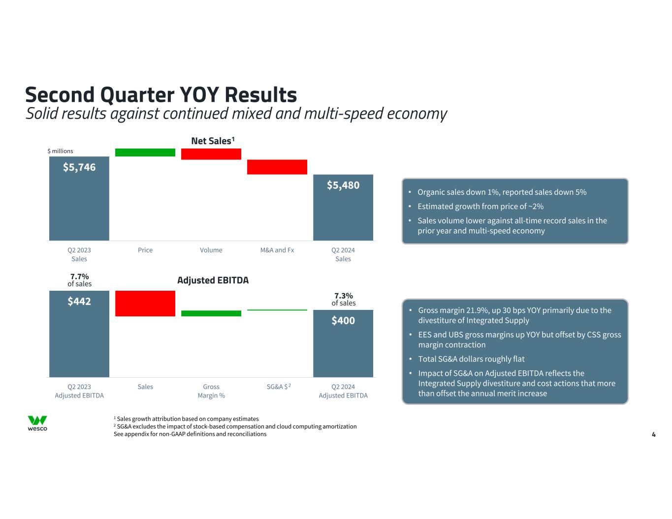 3 Second Quarter Summary and Outlook Global capabilities, leading scale and expanded portfolio drive improving sequential growth in the second half See appendix for non-GAAP reconciliations Results were somewhat below our expectations for a low-single digit decline against a continued mixed and multi-speed economy ― Organic sales down 1% versus all-time quarterly record sales in the prior year period and up 5% sequentially ― EES and CSS organic sales growth rates improved every month throughout the quarter ― Strong growth in data center driven by AI, offset by a significant slowdown of purchases by utility customers ― Adjusted EBITDA margin up 90 basis points sequentially and down 40 basis points YOY Record first half free cash flow of $500 million; completed share repurchase utilizing net divestiture proceeds ― Completed $300 million of share repurchases in Q2 (1.7 million shares) ― Reached agreement to acquire entroCIM, a data center and building intelligence software company, and Storeroom Logix, an asset and inventory management software company ― On track to deliver full year free cash flow of $800 million to $1 billion Expect mixed economic environment and customer purchasing delays in utility and broadband to continue through the second half of 2024 ― Reducing full-year outlook to account for utility market slowdown and year-to-date performance ― Continue to expect 2H sequential sales growth against an easier year-over-year comparable, but at a more modest rate ― Expect reported sales to be down (3.5)% to (1.5)% and EBITDA margin of 7.0% to 7.3%; ~$1.55B of EBITDA at the mid-point