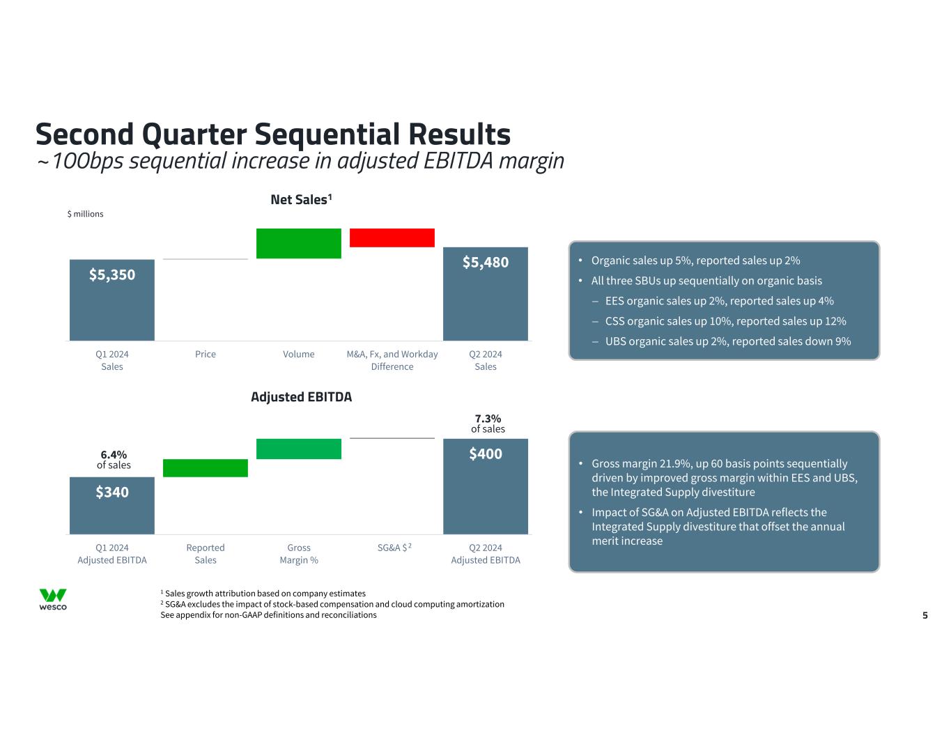 4 $5,746 $5,480 Q2 2023 Sales Price Volume M&A and Fx Q2 2024 Sales Adjusted EBITDA Net Sales1 Second Quarter YOY Results Solid results against continued mixed and multi-speed economy $ millions 1 Sales growth attribution based on company estimates 2 SG&A excludes the impact of stock-based compensation and cloud computing amortization See appendix for non-GAAP definitions and reconciliations • Organic sales down 1%, reported sales down 5% • Estimated growth from price of ~2% • Sales volume lower against all-time record sales in the prior year and multi-speed economy • Gross margin 21.9%, up 30 bps YOY primarily due to the divestiture of Integrated Supply • EES and UBS gross margins up YOY but offset by CSS gross margin contraction • Total SG&A dollars roughly flat • Impact of SG&A on Adjusted EBITDA reflects the Integrated Supply divestiture and cost actions that more than offset the annual merit increase $442 $400 Q2 2023 Adjusted EBITDA Sales Gross Margin % SG&A $ Q2 2024 Adjusted EBITDA 7.3% of sales 7.7% of sales 2