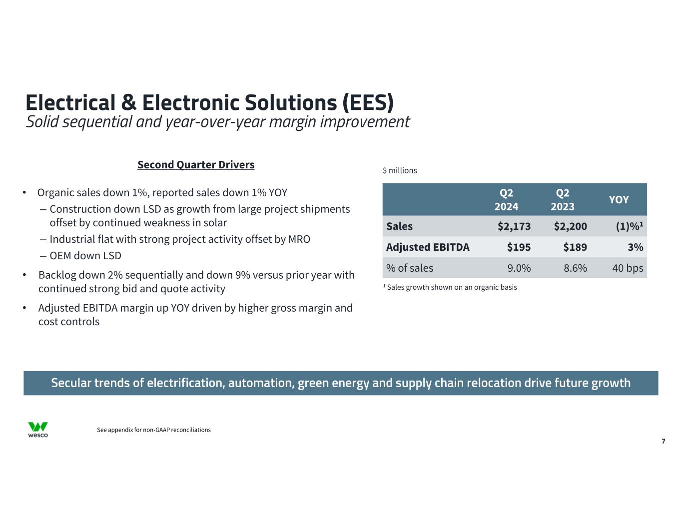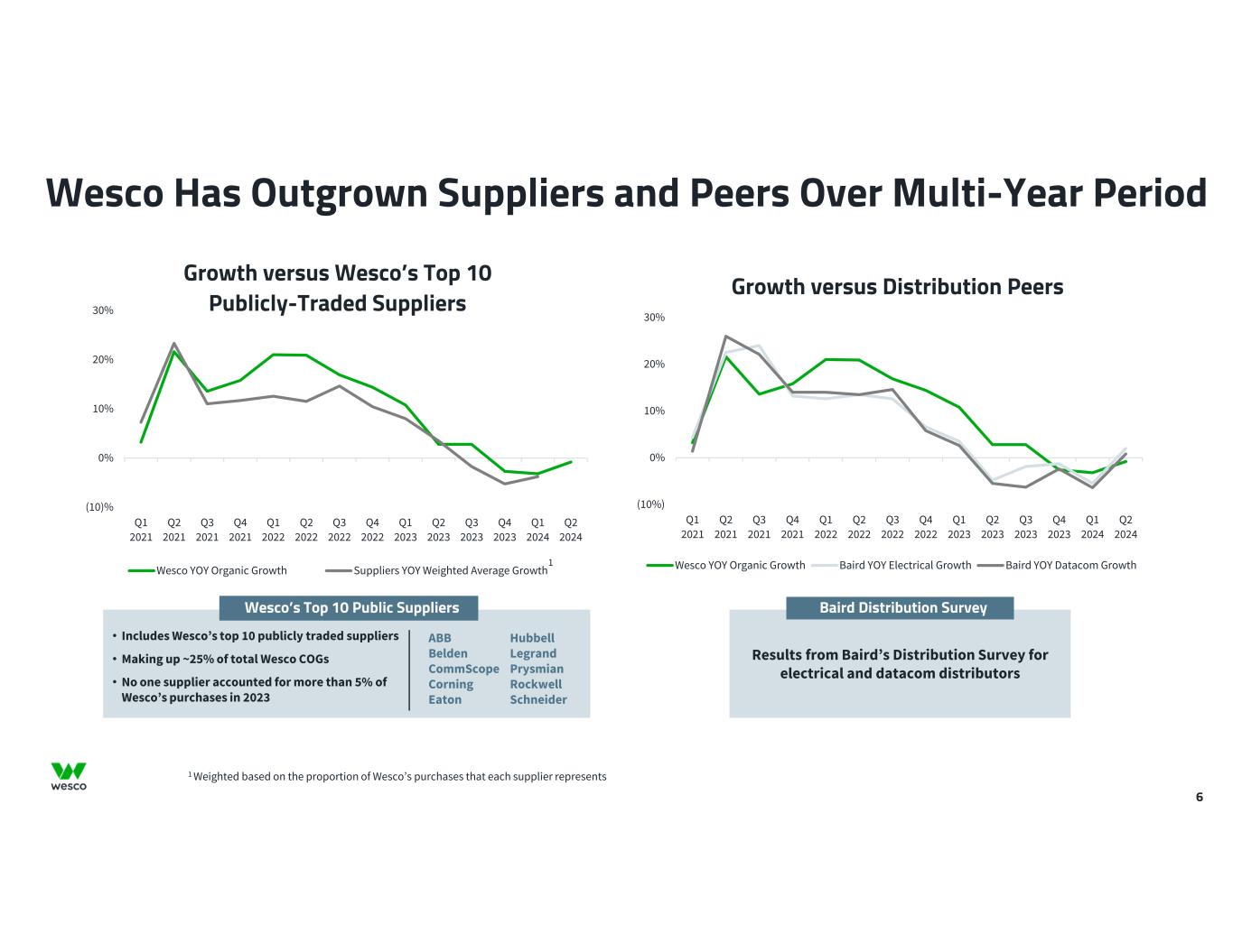 6 (10%) 0% 10% 20% 30% Q1 2021 Q2 2021 Q3 2021 Q4 2021 Q1 2022 Q2 2022 Q3 2022 Q4 2022 Q1 2023 Q2 2023 Q3 2023 Q4 2023 Q1 2024 Q2 2024 Wesco YOY Organic Growth Baird YOY Electrical Growth Baird YOY Datacom Growth (10)% 0% 10% 20% 30% Q1 2021 Q2 2021 Q3 2021 Q4 2021 Q1 2022 Q2 2022 Q3 2022 Q4 2022 Q1 2023 Q2 2023 Q3 2023 Q4 2023 Q1 2024 Q2 2024 Wesco YOY Organic Growth Suppliers YOY Weighted Average Growth Wesco Has Outgrown Suppliers and Peers Over Multi-Year Period ABB Belden CommScope Corning Eaton Hubbell Legrand Prysmian Rockwell Schneider Results from Baird’s Distribution Survey for electrical and datacom distributors Baird Distribution SurveyWesco’s Top 10 Public Suppliers • Includes Wesco’s top 10 publicly traded suppliers • Making up ~25% of total Wesco COGs • No one supplier accounted for more than 5% of Wesco’s purchases in 2023 Growth versus Wesco’s Top 10 Publicly-Traded Suppliers Growth versus Distribution Peers 1 Weighted based on the proportion of Wesco’s purchases that each supplier represents 1