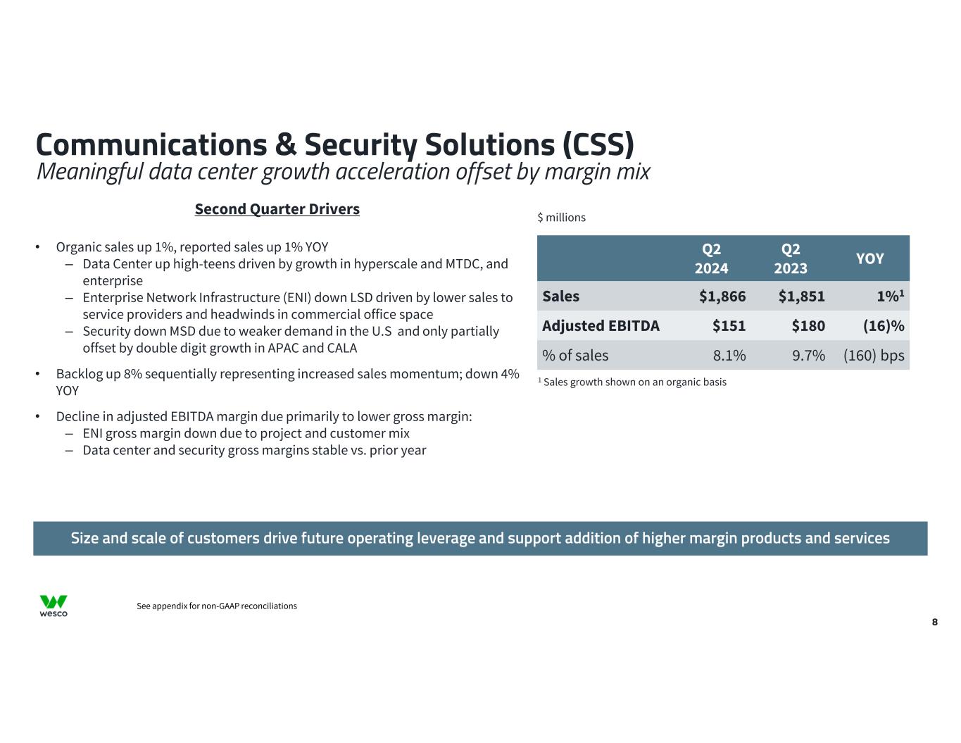 Secular trends of electrification, automation, green energy and supply chain relocation drive future growth Second Quarter Drivers • Organic sales down 1%, reported sales down 1% YOY – Construction down LSD as growth from large project shipments offset by continued weakness in solar – Industrial flat with strong project activity offset by MRO – OEM down LSD • Backlog down 2% sequentially and down 9% versus prior year with continued strong bid and quote activity • Adjusted EBITDA margin up YOY driven by higher gross margin and cost controls Electrical & Electronic Solutions (EES) Solid sequential and year-over-year margin improvement 7 $ millions YOYQ2 2023 Q2 2024 (1)%1$2,200$2,173Sales 3%$189$195Adjusted EBITDA 40 bps8.6%9.0%% of sales 1 Sales growth shown on an organic basis See appendix for non-GAAP reconciliations