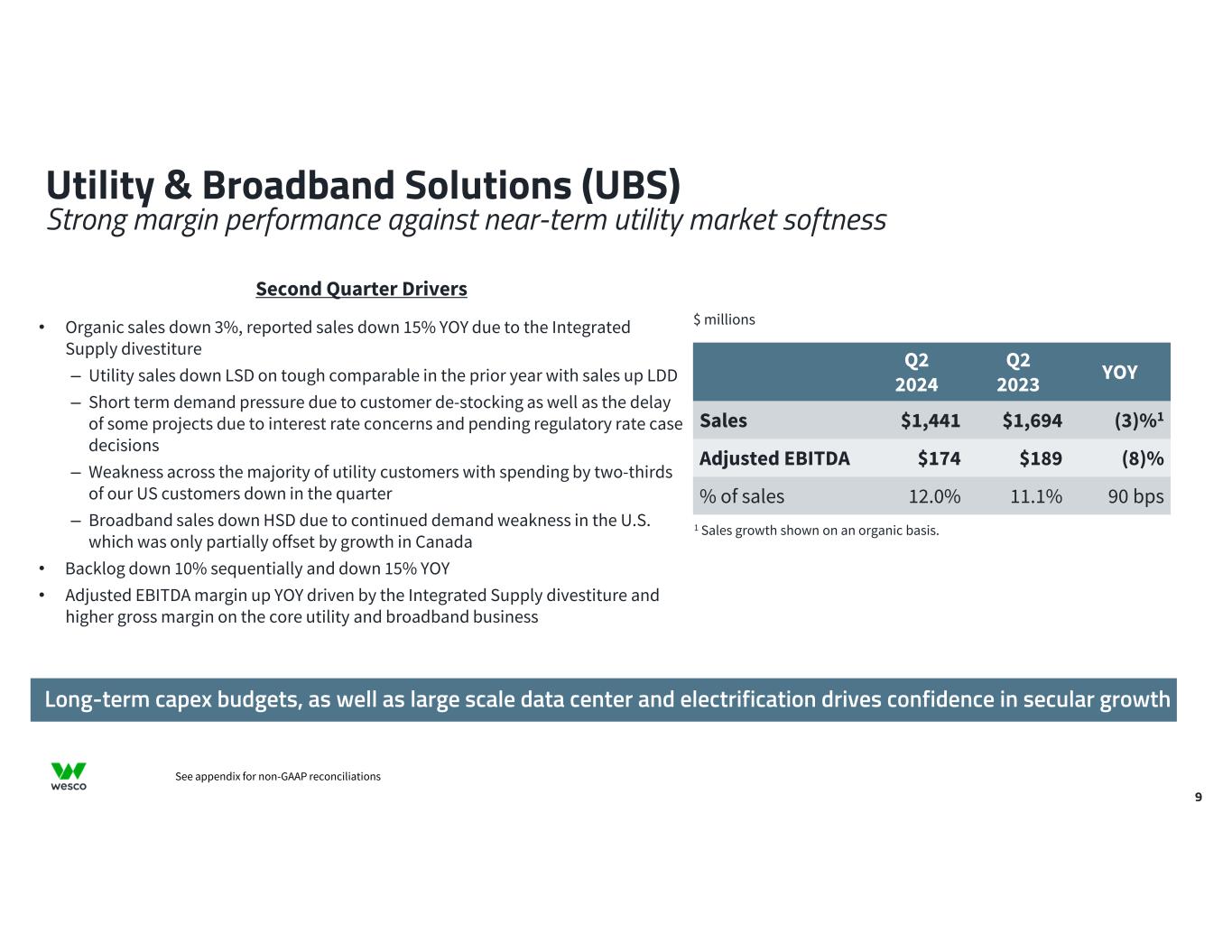 Communications & Security Solutions (CSS) Meaningful data center growth acceleration offset by margin mix 8 YOYQ2 2023 Q2 2024 1%1$1,851$1,866Sales (16)%$180$151Adjusted EBITDA (160) bps9.7%8.1%% of sales Second Quarter Drivers • Organic sales up 1%, reported sales up 1% YOY – Data Center up high-teens driven by growth in hyperscale and MTDC, and enterprise – Enterprise Network Infrastructure (ENI) down LSD driven by lower sales to service providers and headwinds in commercial office space – Security down MSD due to weaker demand in the U.S and only partially offset by double digit growth in APAC and CALA • Backlog up 8% sequentially representing increased sales momentum; down 4% YOY • Decline in adjusted EBITDA margin due primarily to lower gross margin: – ENI gross margin down due to project and customer mix – Data center and security gross margins stable vs. prior year $ millions 1 Sales growth shown on an organic basis Size and scale of customers drive future operating leverage and support addition of higher margin products and services See appendix for non-GAAP reconciliations