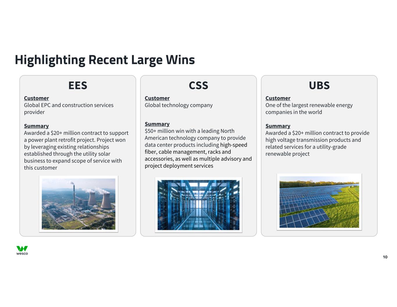 10 Highlighting Recent Large Wins CSS Customer Global technology company Summary $50+ million win with a leading North American technology company to provide data center products including high-speed fiber, cable management, racks and accessories, as well as multiple advisory and project deployment services UBS Customer One of the largest renewable energy companies in the world Summary Awarded a $20+ million contract to provide high voltage transmission products and related services for a utility-grade renewable project EES Customer Global EPC and construction services provider Summary Awarded a $20+ million contract to support a power plant retrofit project. Project won by leveraging existing relationships established through the utility solar business to expand scope of service with this customer
