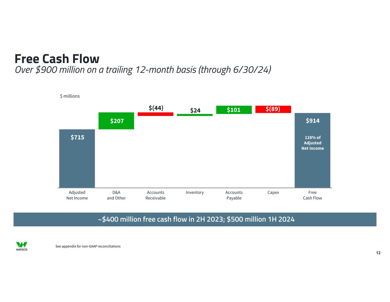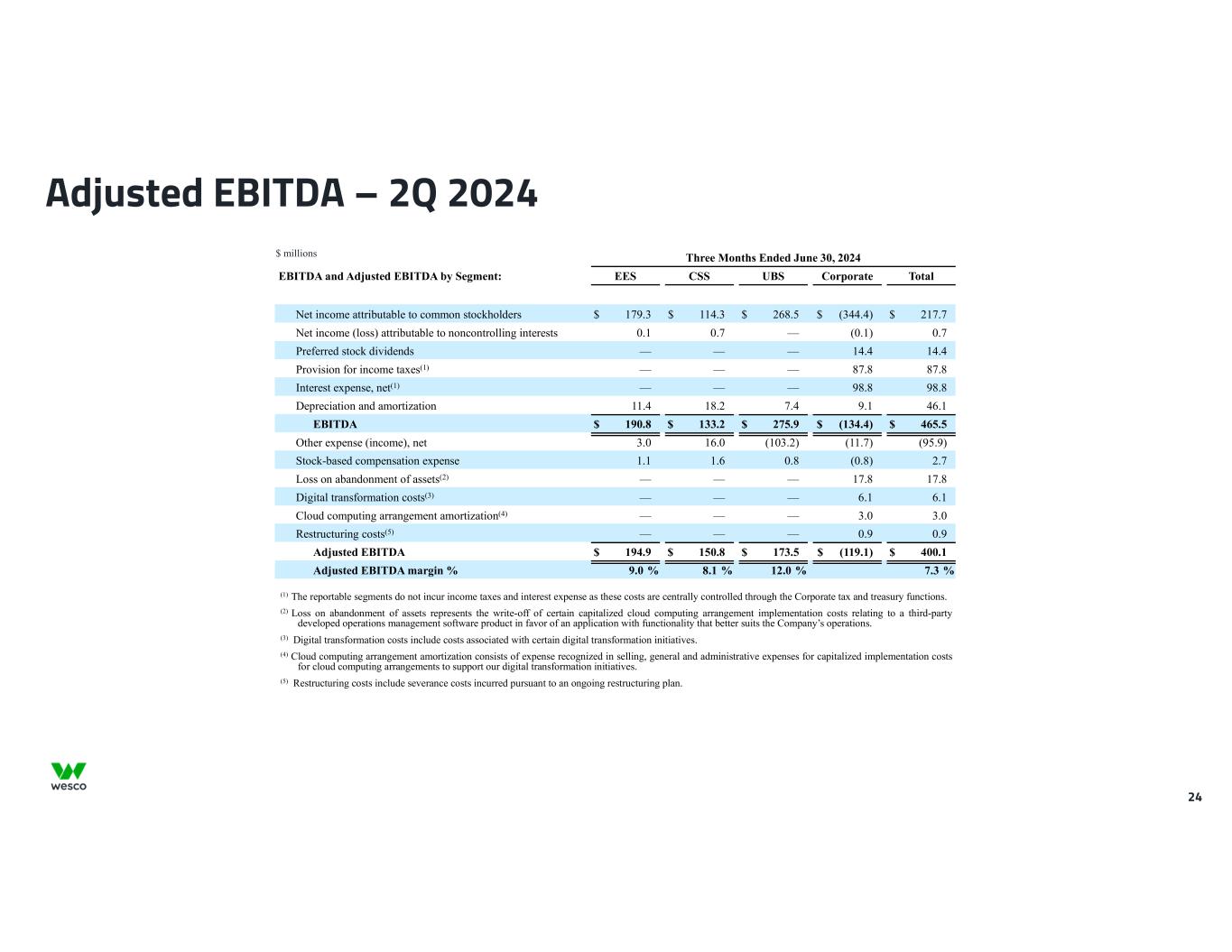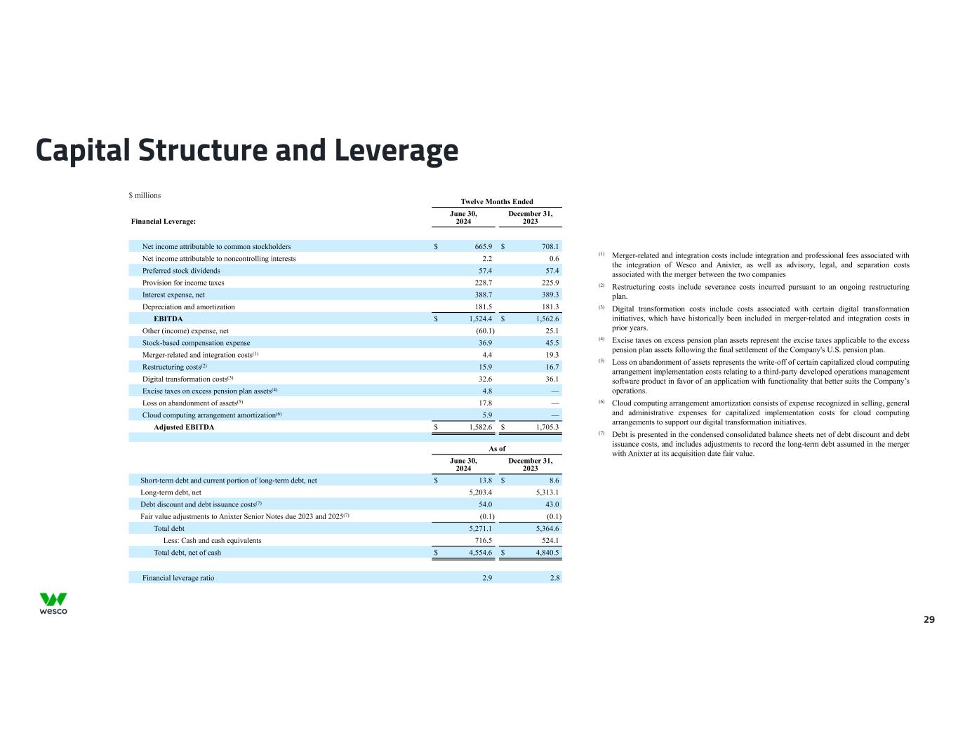 Twelve Months Ended Financial Leverage: June 30, 2024 December 31, 2023 Net income attributable to common stockholders $ 665.9 $ 708.1 Net income attributable to noncontrolling interests 2.2 0.6 Preferred stock dividends 57.4 57.4 Provision for income taxes 228.7 225.9 Interest expense, net 388.7 389.3 Depreciation and amortization 181.5 181.3 EBITDA $ 1,524.4 $ 1,562.6 Other (income) expense, net (60.1) 25.1 Stock-based compensation expense 36.9 45.5 Merger-related and integration costs(1) 4.4 19.3 Restructuring costs(2) 15.9 16.7 Digital transformation costs(3) 32.6 36.1 Excise taxes on excess pension plan assets(4) 4.8 — Loss on abandonment of assets(5) 17.8 — Cloud computing arrangement amortization(6) 5.9 — Adjusted EBITDA $ 1,582.6 $ 1,705.3 As of June 30, 2024 December 31, 2023 Short-term debt and current portion of long-term debt, net $ 13.8 $ 8.6 Long-term debt, net 5,203.4 5,313.1 Debt discount and debt issuance costs(7) 54.0 43.0 Fair value adjustments to Anixter Senior Notes due 2023 and 2025(7) (0.1) (0.1) Total debt 5,271.1 5,364.6 Less: Cash and cash equivalents 716.5 524.1 Total debt, net of cash $ 4,554.6 $ 4,840.5 Financial leverage ratio 2.9 2.8 Capital Structure and Leverage 29 $ millions (1) Merger-related and integration costs include integration and professional fees associated with the integration of Wesco and Anixter, as well as advisory, legal, and separation costs associated with the merger between the two companies (2) Restructuring costs include severance costs incurred pursuant to an ongoing restructuring plan. (3) Digital transformation costs include costs associated with certain digital transformation initiatives, which have historically been included in merger-related and integration costs in prior years. (4) Excise taxes on excess pension plan assets represent the excise taxes applicable to the excess pension plan assets following the final settlement of the Company's U.S. pension plan. (5) Loss on abandonment of assets represents the write-off of certain capitalized cloud computing arrangement implementation costs relating to a third-party developed operations management software product in favor of an application with functionality that better suits the Company’s operations. (6) Cloud computing arrangement amortization consists of expense recognized in selling, general and administrative expenses for capitalized implementation costs for cloud computing arrangements to support our digital transformation initiatives. (7) Debt is presented in the condensed consolidated balance sheets net of debt discount and debt issuance costs, and includes adjustments to record the long-term debt assumed in the merger with Anixter at its acquisition date fair value.