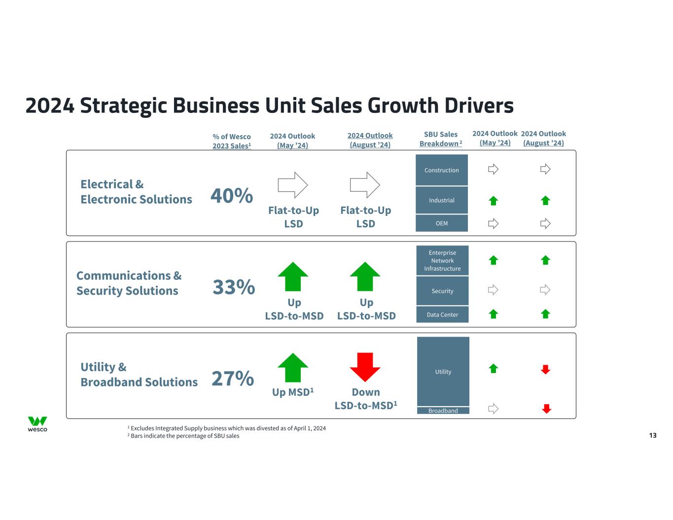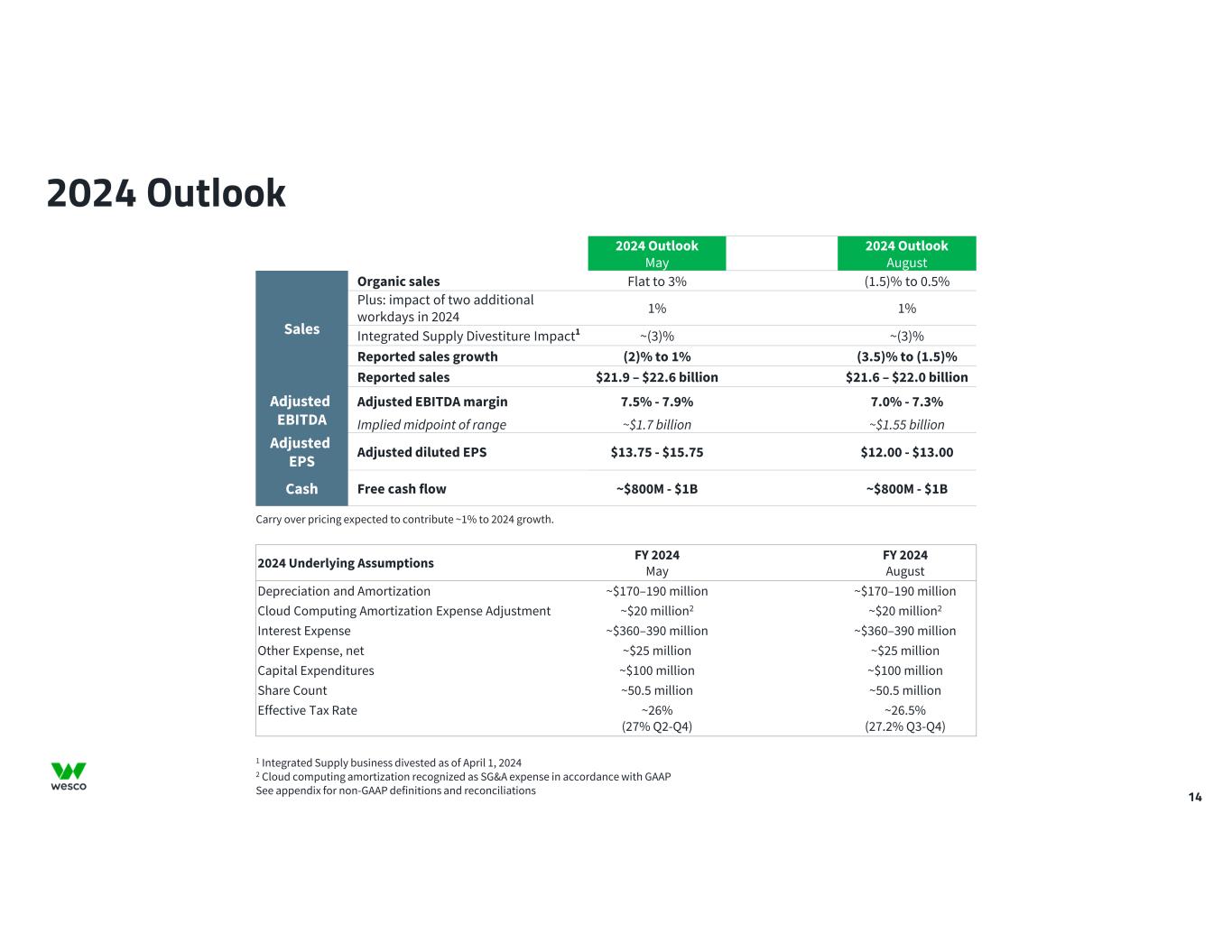 13 2024 Strategic Business Unit Sales Growth Drivers OEM Industrial Construction Electrical & Electronic Solutions 40% Flat-to-Up LSD Data Center Security Enterprise Network Infrastructure 33% Up LSD-to-MSD Communications & Security Solutions Broadband Utility27% Down LSD-to-MSD1 Utility & Broadband Solutions 2024 Outlook (August ’24) % of Wesco 2023 Sales1 1 Excludes Integrated Supply business which was divested as of April 1, 2024 2 Bars indicate the percentage of SBU sales SBU Sales Breakdown 2 2024 Outlook (May ’24) 2024 Outlook (August ’24) Flat-to-Up LSD Up LSD-to-MSD Up MSD1 2024 Outlook (May ’24)