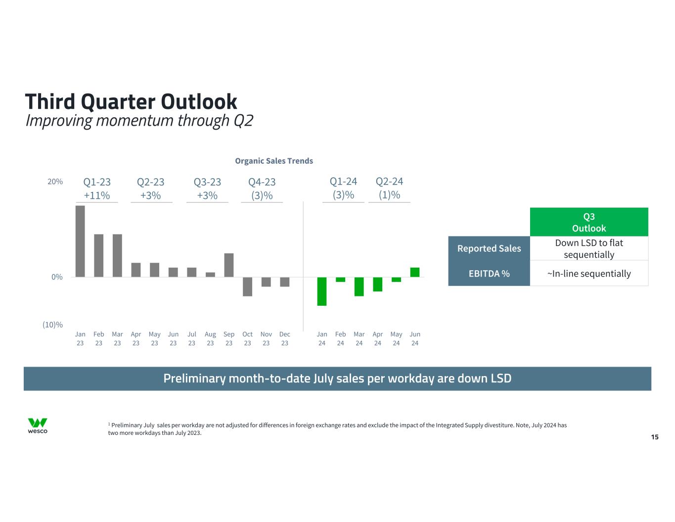 14 2024 Outlook Carry over pricing expected to contribute ~1% to 2024 growth. 2024 Outlook August 2024 Outlook May (1.5)% to 0.5%Flat to 3%Organic sales Sales 1%1%Plus: impact of two additional workdays in 2024 ~(3)%~(3)%Integrated Supply Divestiture Impact1 (3.5)% to (1.5)%(2)% to 1%Reported sales growth $21.6 – $22.0 billion$21.9 – $22.6 billionReported sales 7.0% - 7.3%7.5% - 7.9%Adjusted EBITDA marginAdjusted EBITDA ~$1.55 billion~$1.7 billionImplied midpoint of range $12.00 - $13.00$13.75 - $15.75Adjusted diluted EPSAdjusted EPS ~$800M - $1B~$800M - $1BFree cash flowCash FY 2024 August FY 2024 May2024 Underlying Assumptions ~$170–190 million~$170–190 millionDepreciation and Amortization ~$20 million2~$20 million2Cloud Computing Amortization Expense Adjustment ~$360–390 million~$360–390 millionInterest Expense ~$25 million~$25 millionOther Expense, net ~$100 million~$100 millionCapital Expenditures ~50.5 million~50.5 millionShare Count ~26.5% (27.2% Q3-Q4) ~26% (27% Q2-Q4) Effective Tax Rate 1 Integrated Supply business divested as of April 1, 2024 2 Cloud computing amortization recognized as SG&A expense in accordance with GAAP See appendix for non-GAAP definitions and reconciliations