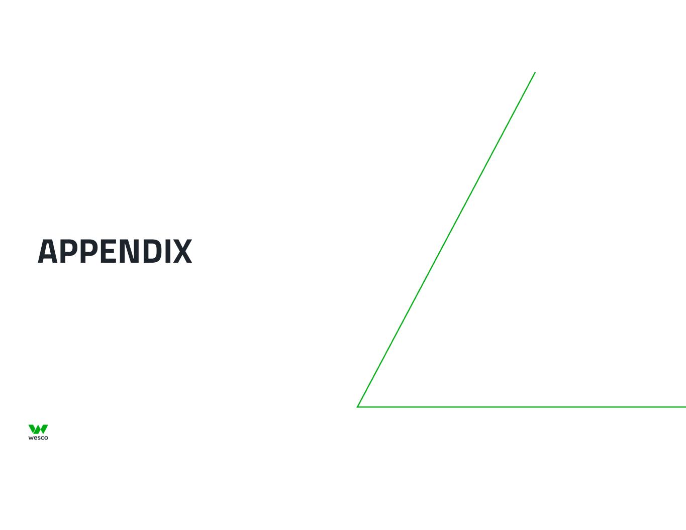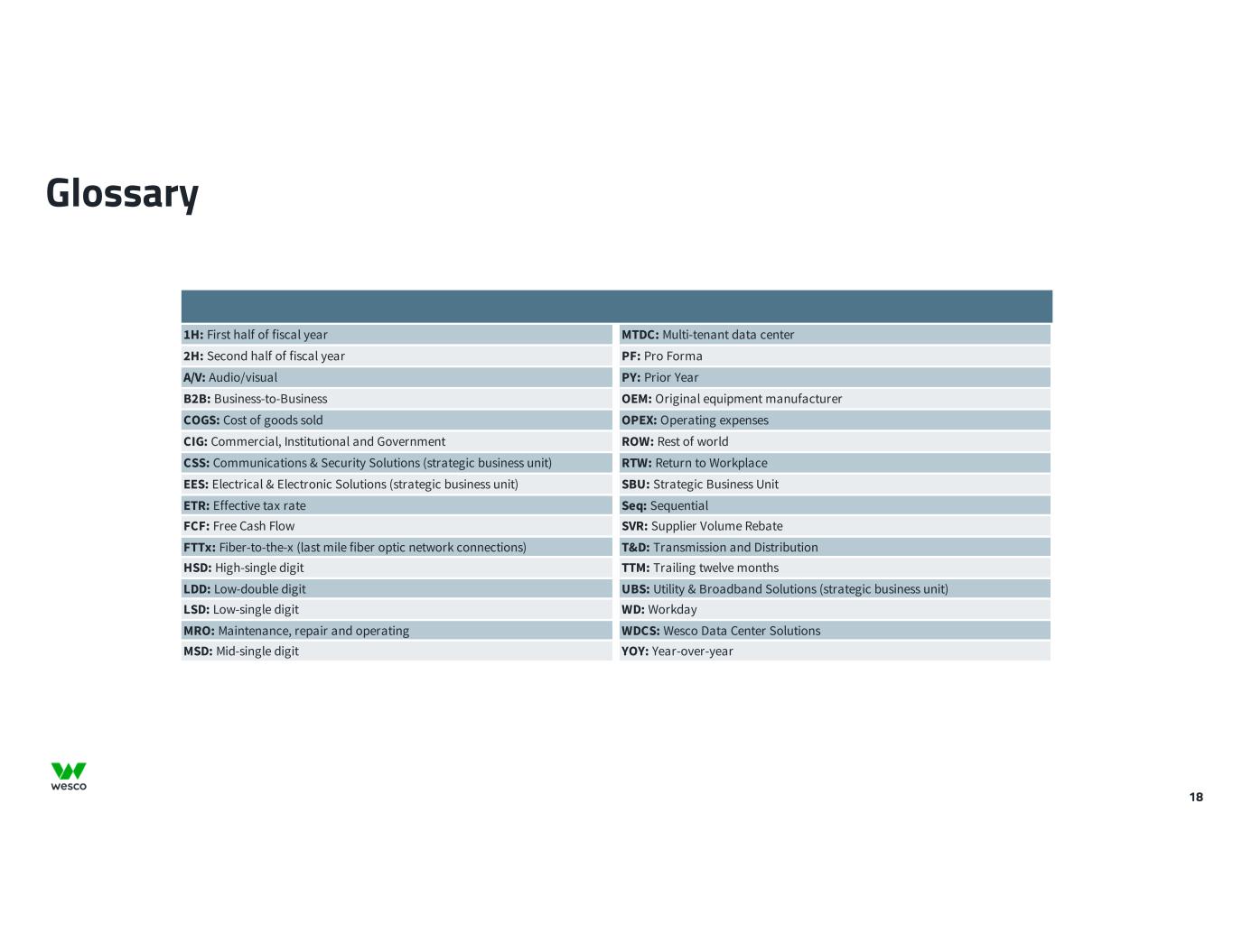 18 Glossary 1H: First half of fiscal year MTDC: Multi-tenant data center 2H: Second half of fiscal year PF: Pro Forma A/V: Audio/visual PY: Prior Year B2B: Business-to-Business OEM: Original equipment manufacturer COGS: Cost of goods sold OPEX: Operating expenses CIG: Commercial, Institutional and Government ROW: Rest of world CSS: Communications & Security Solutions (strategic business unit) RTW: Return to Workplace EES: Electrical & Electronic Solutions (strategic business unit) SBU: Strategic Business Unit ETR: Effective tax rate Seq: Sequential FCF: Free Cash Flow SVR: Supplier Volume Rebate FTTx: Fiber-to-the-x (last mile fiber optic network connections)   T&D: Transmission and Distribution HSD: High-single digit TTM: Trailing twelve months LDD: Low-double digit UBS: Utility & Broadband Solutions (strategic business unit) LSD: Low-single digit WD: Workday MRO: Maintenance, repair and operating WDCS: Wesco Data Center Solutions MSD: Mid-single digit YOY: Year-over-year