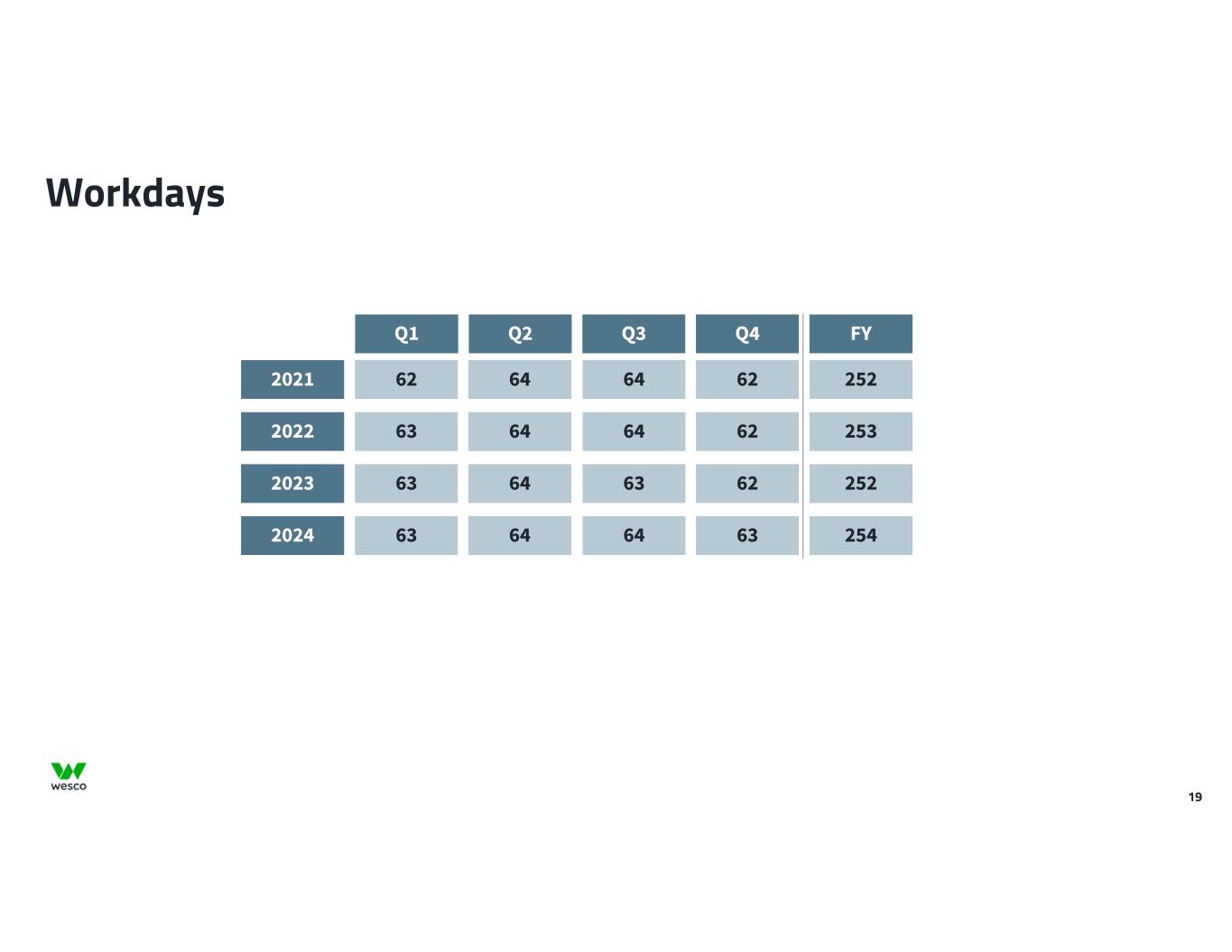 19 Workdays Q1 Q2 Q3 Q4 FY 2021 62 64 64 62 252 2022 63 64 64 62 253 2023 63 64 63 62 252 2024 63 64 64 63 254