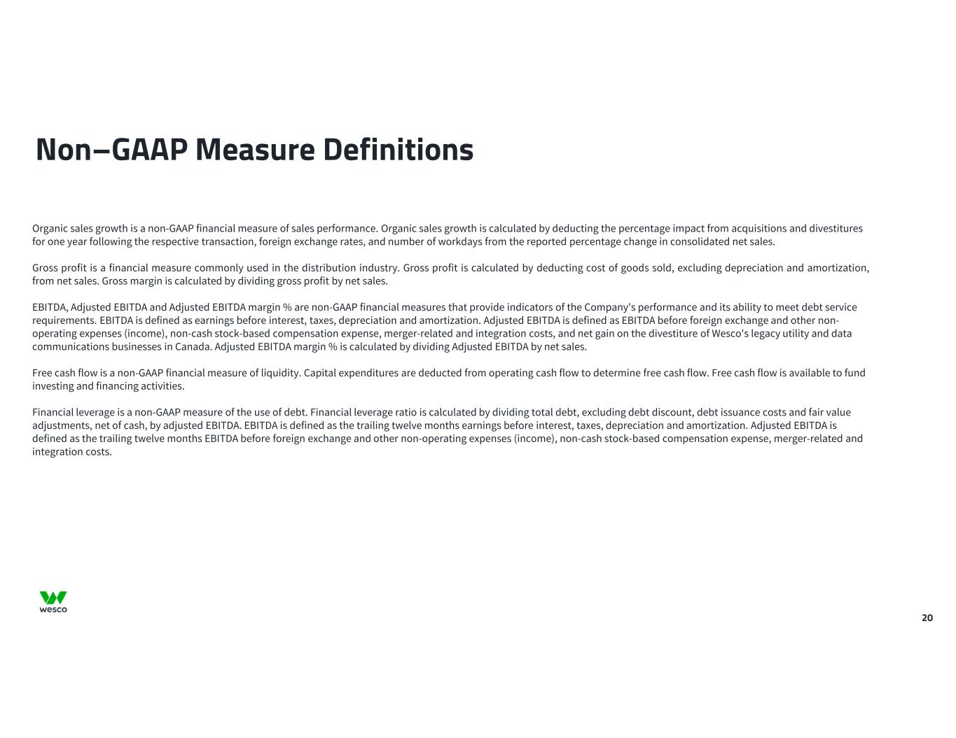 20 Non–GAAP Measure Definitions Organic sales growth is a non-GAAP financial measure of sales performance. Organic sales growth is calculated by deducting the percentage impact from acquisitions and divestitures for one year following the respective transaction, foreign exchange rates, and number of workdays from the reported percentage change in consolidated net sales. Gross profit is a financial measure commonly used in the distribution industry. Gross profit is calculated by deducting cost of goods sold, excluding depreciation and amortization, from net sales. Gross margin is calculated by dividing gross profit by net sales. EBITDA, Adjusted EBITDA and Adjusted EBITDA margin % are non-GAAP financial measures that provide indicators of the Company's performance and its ability to meet debt service requirements. EBITDA is defined as earnings before interest, taxes, depreciation and amortization. Adjusted EBITDA is defined as EBITDA before foreign exchange and other non- operating expenses (income), non-cash stock-based compensation expense, merger-related and integration costs, and net gain on the divestiture of Wesco's legacy utility and data communications businesses in Canada. Adjusted EBITDA margin % is calculated by dividing Adjusted EBITDA by net sales. Free cash flow is a non-GAAP financial measure of liquidity. Capital expenditures are deducted from operating cash flow to determine free cash flow. Free cash flow is available to fund investing and financing activities. Financial leverage is a non-GAAP measure of the use of debt. Financial leverage ratio is calculated by dividing total debt, excluding debt discount, debt issuance costs and fair value adjustments, net of cash, by adjusted EBITDA. EBITDA is defined as the trailing twelve months earnings before interest, taxes, depreciation and amortization. Adjusted EBITDA is defined as the trailing twelve months EBITDA before foreign exchange and other non-operating expenses (income), non-cash stock-based compensation expense, merger-related and integration costs.